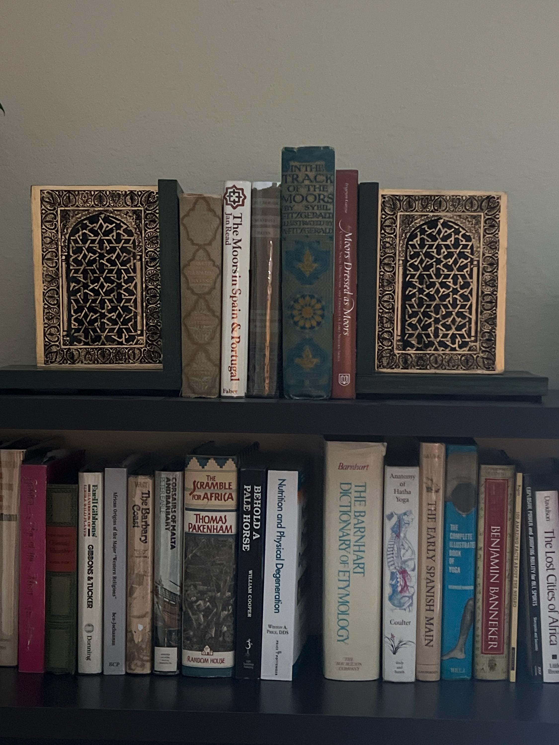 The Amir built a grand mosque in Mamluk Cairo. Most of the mosque was destroyed, several of the carved stucco windows of the mosque survived. This beautiful engraved wood artwork on the bookends made by The arabesque depicts one of those beautiful medieval Mamluk stucco windows of the 14th century.