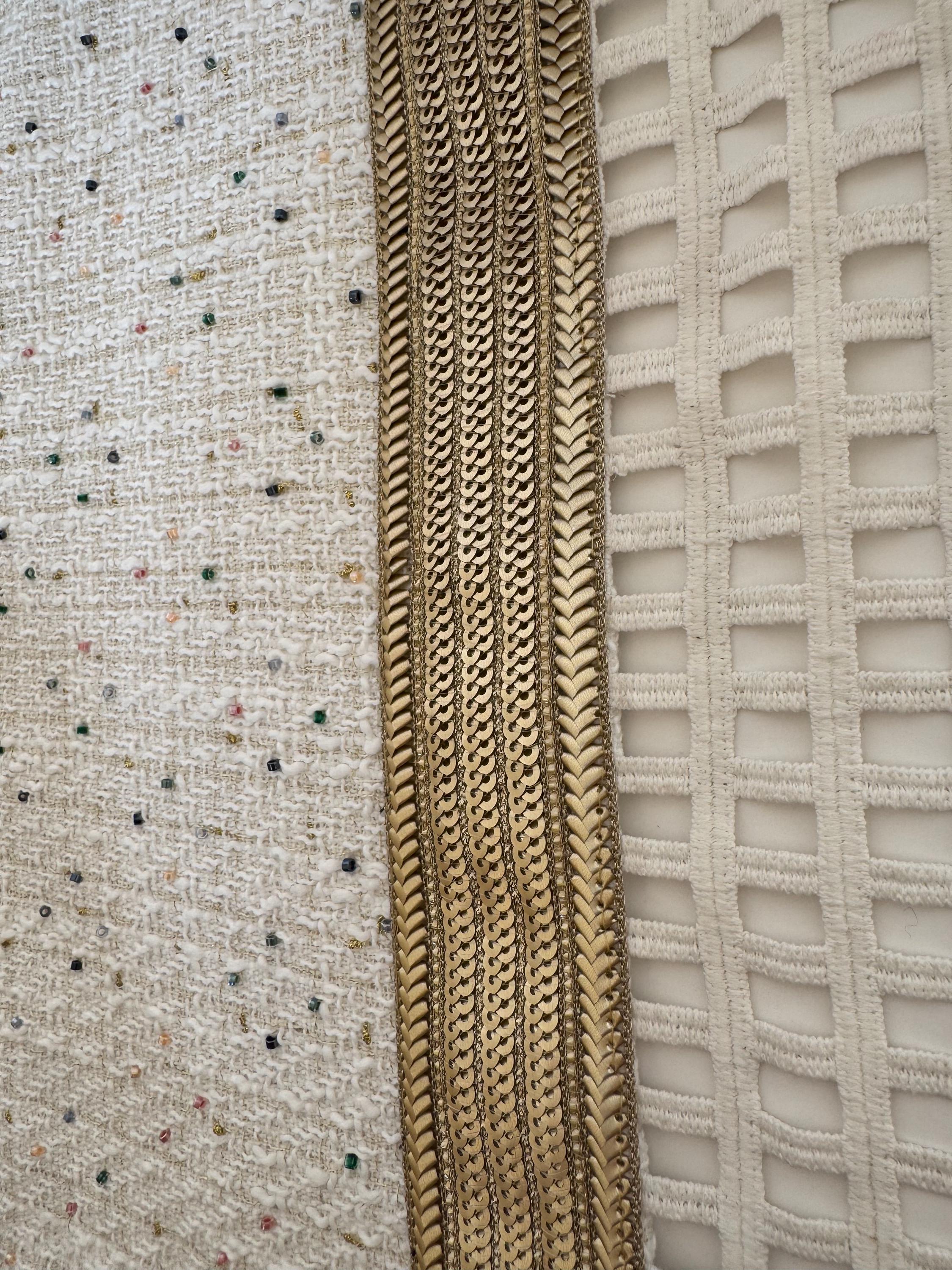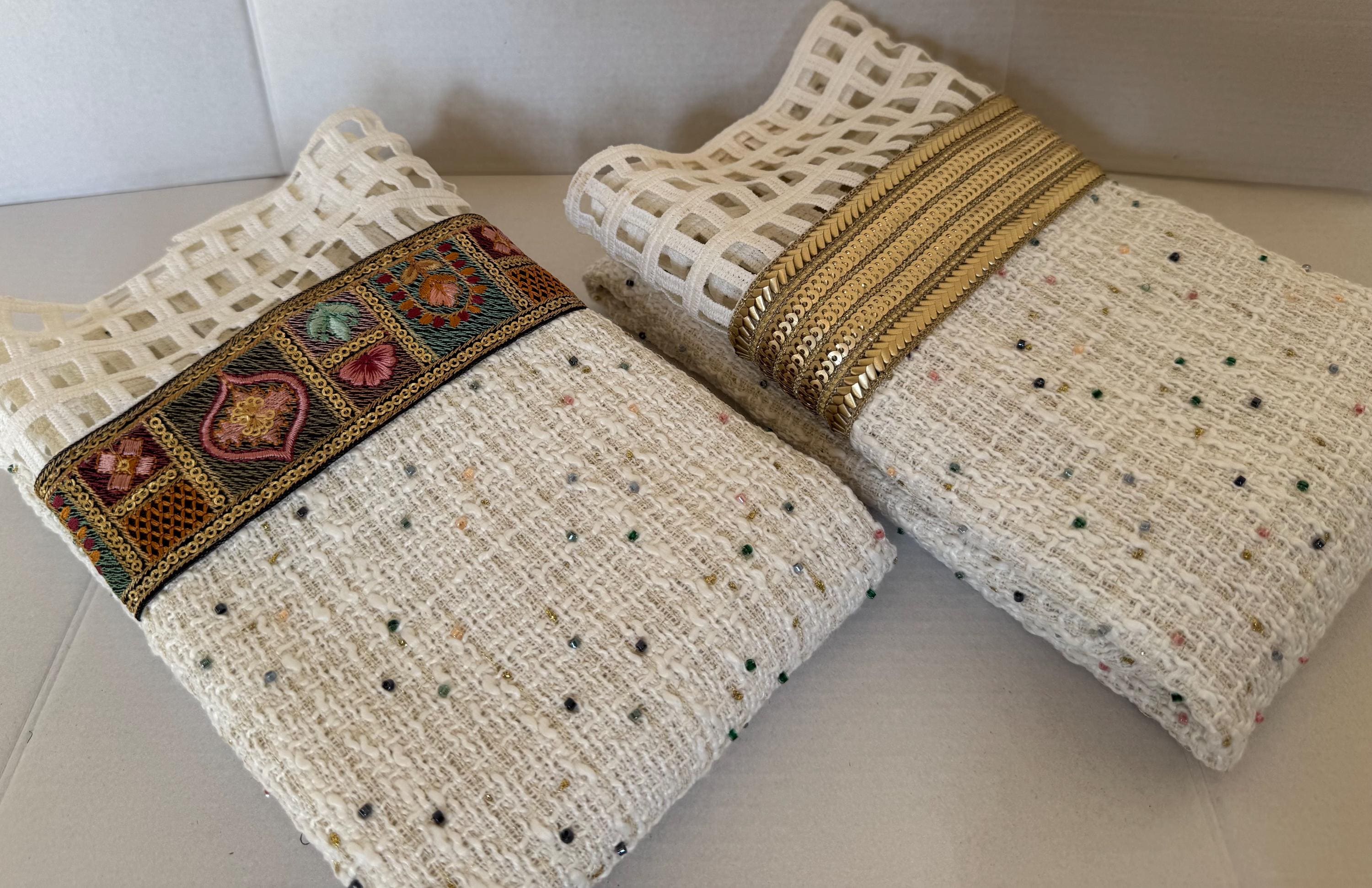 This beautiful handmade scarf has been created with a beaded rich material. We have embellished the scarf with a gorgeous metallic antique gold trim and a lace which makes the scarf perfect for any event.