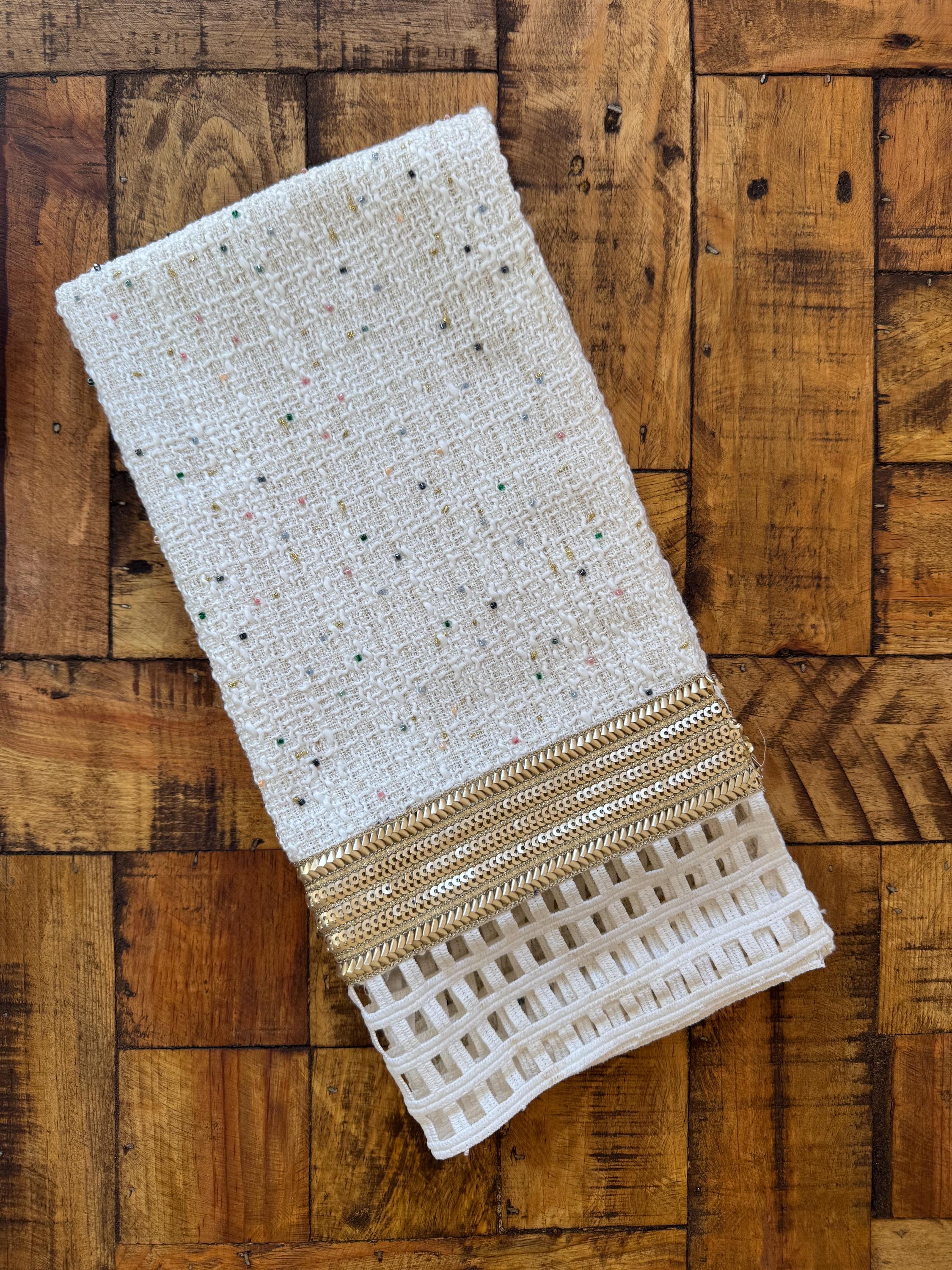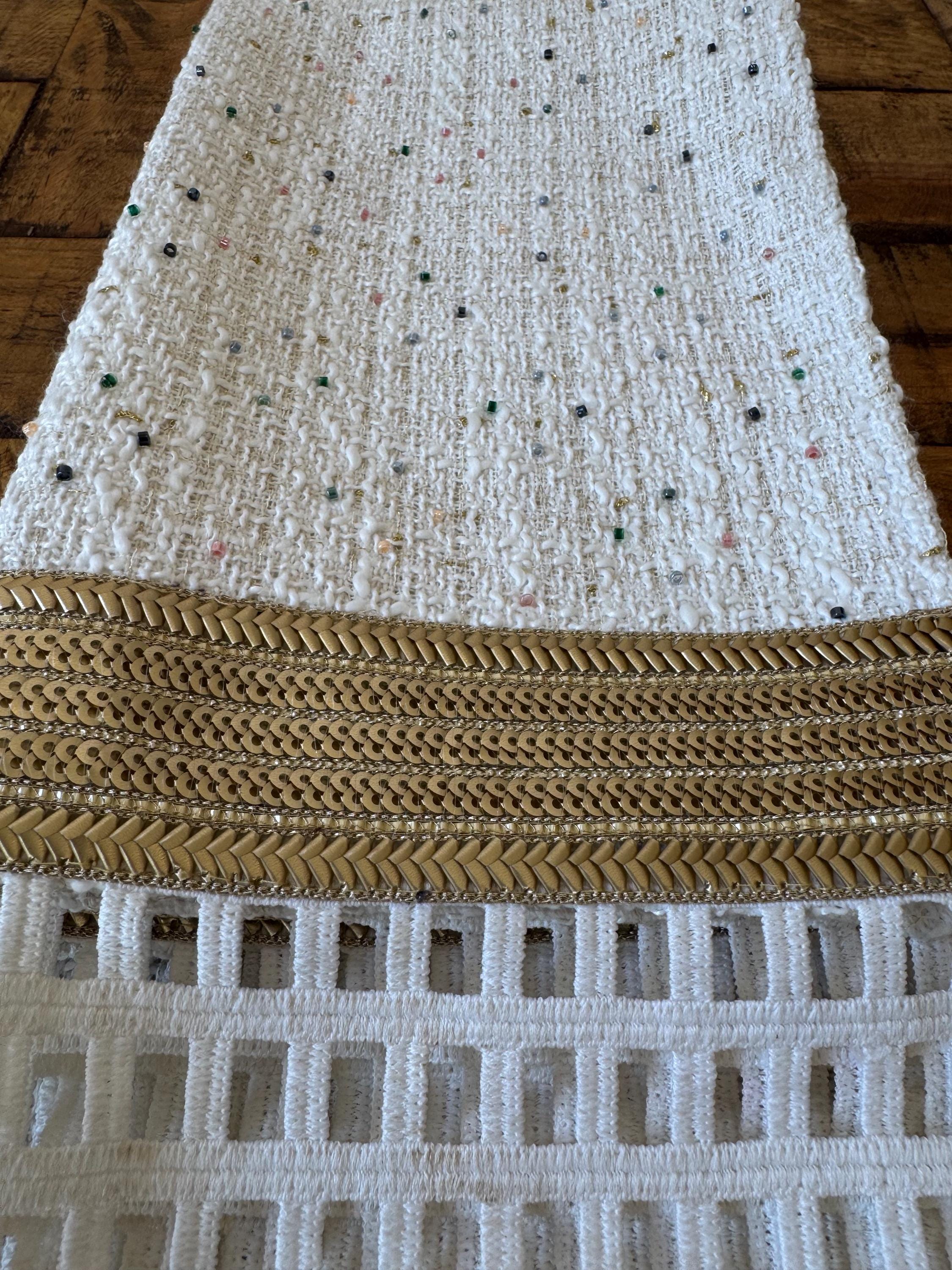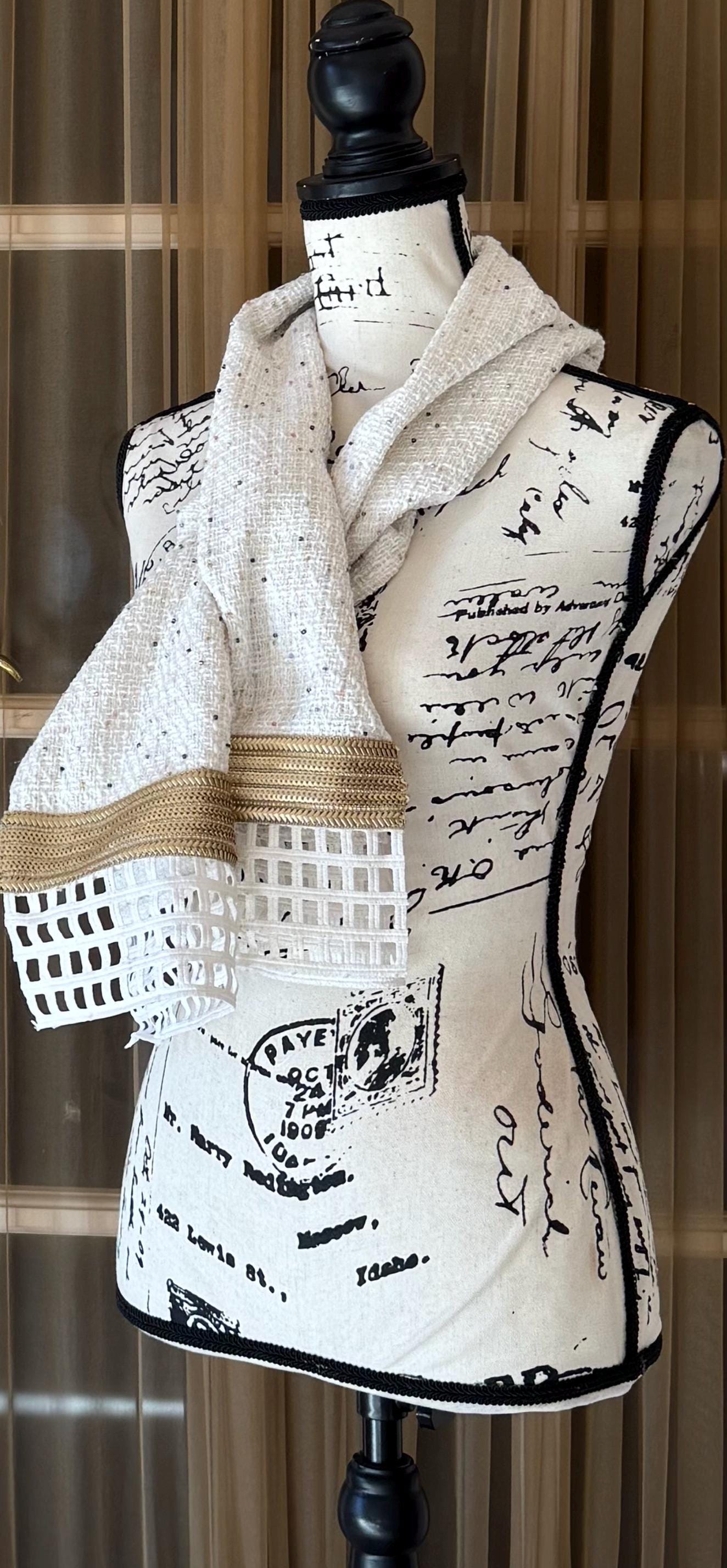 This beautiful handmade scarf has been created with a beaded rich material. We have embellished the scarf with a gorgeous metallic antique gold trim and a lace which makes the scarf perfect for any event.