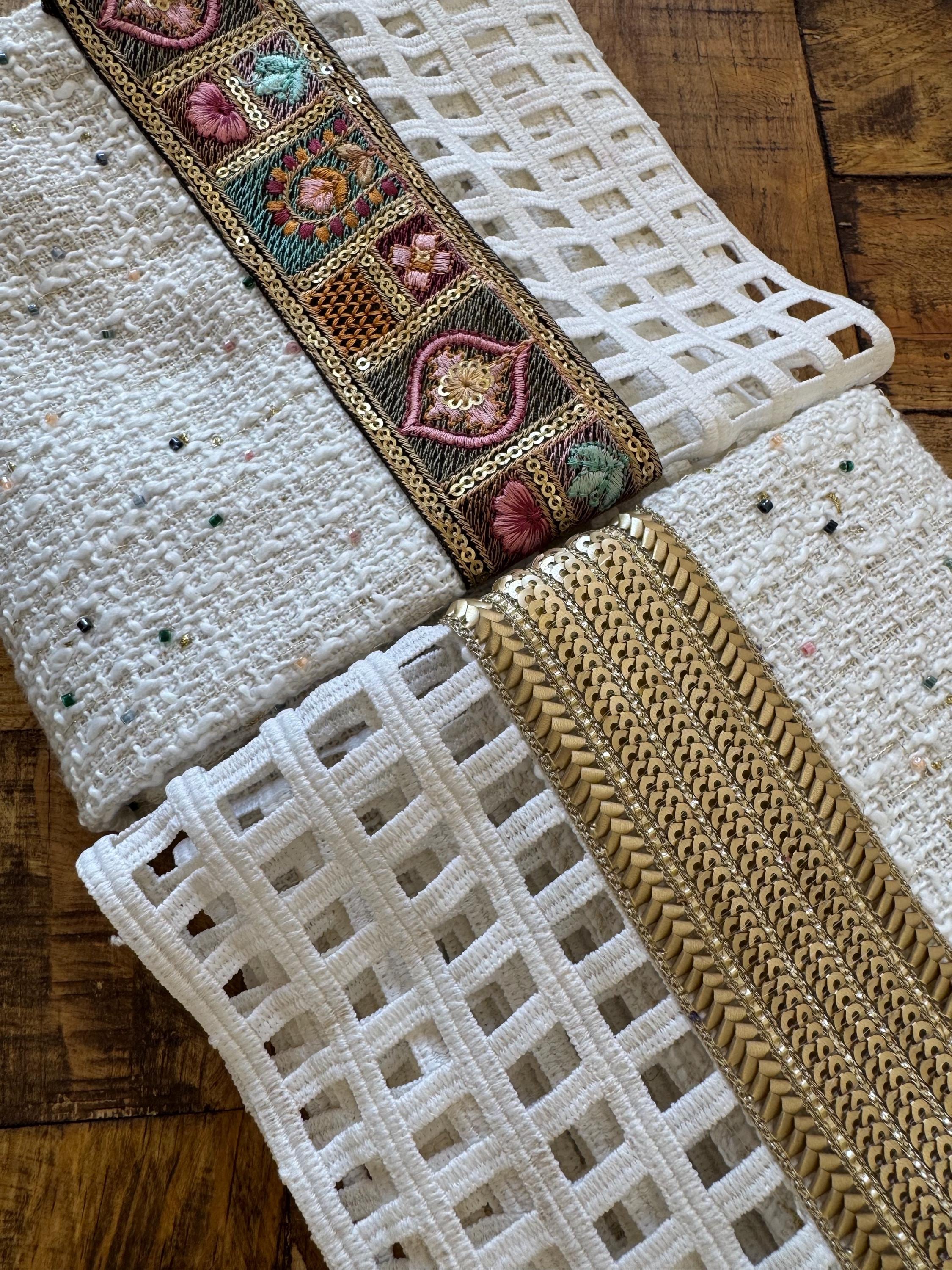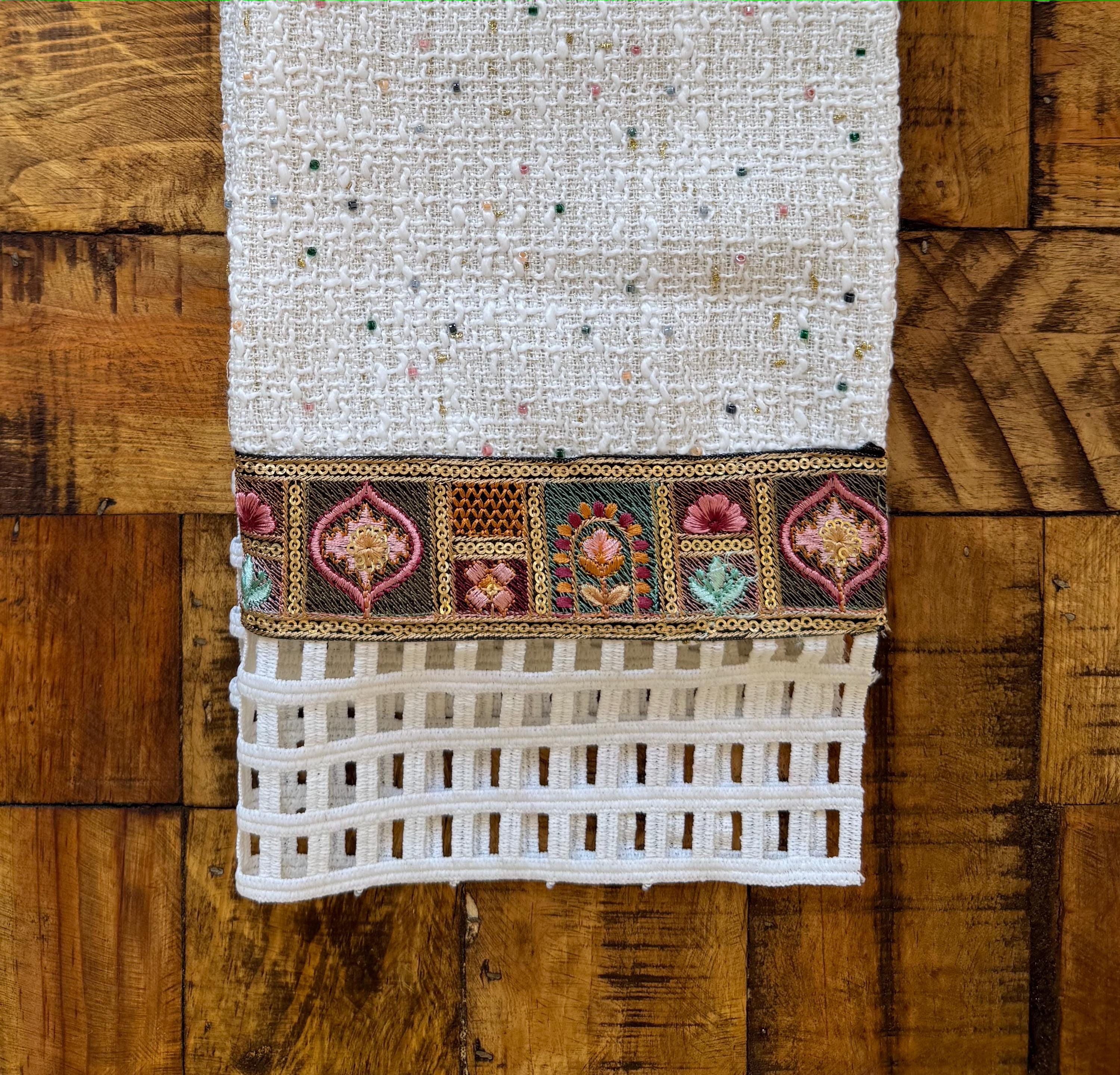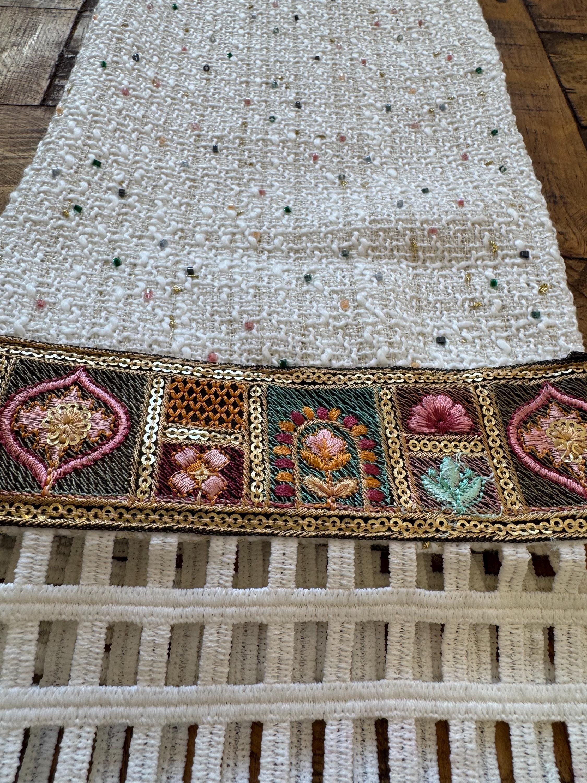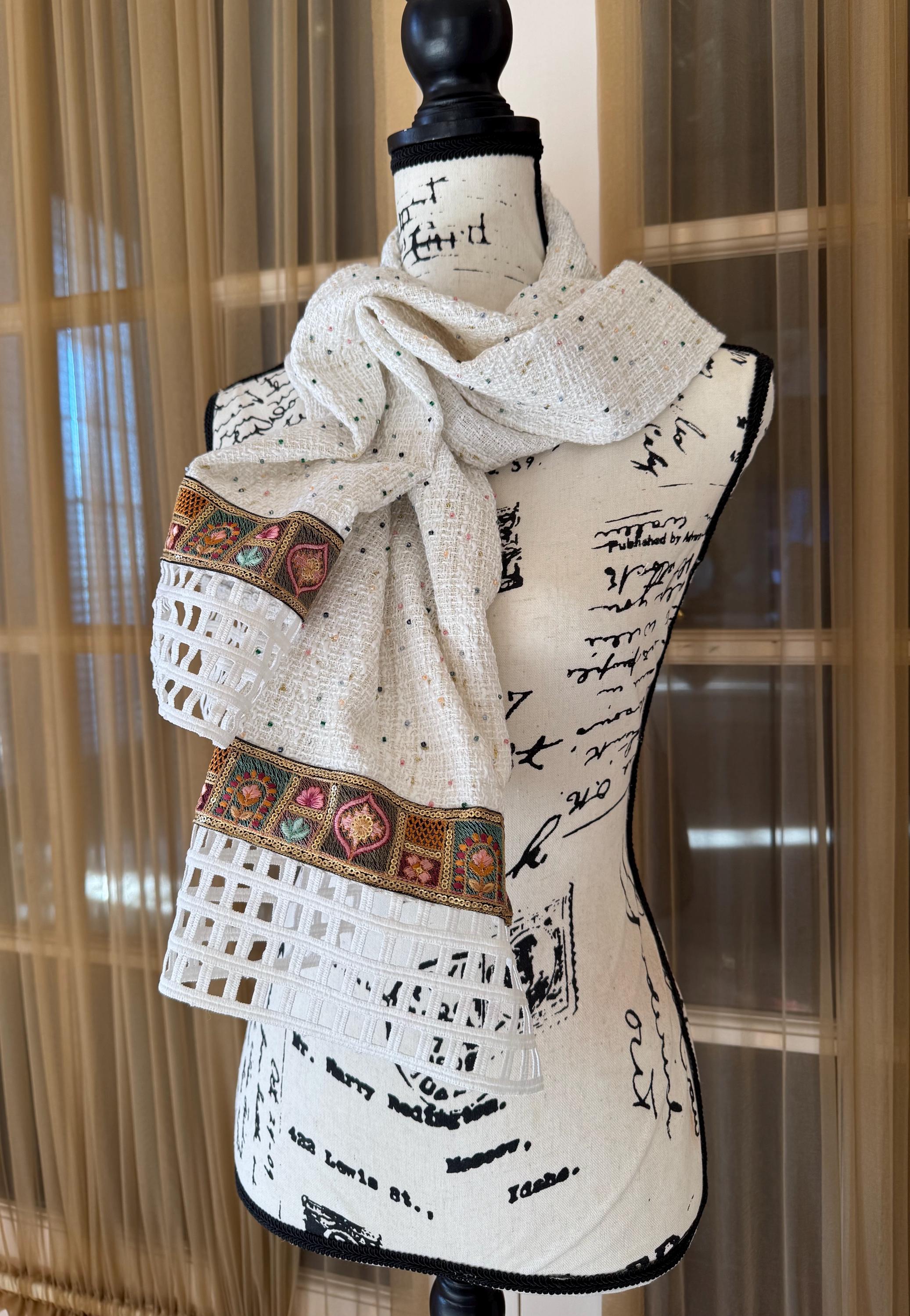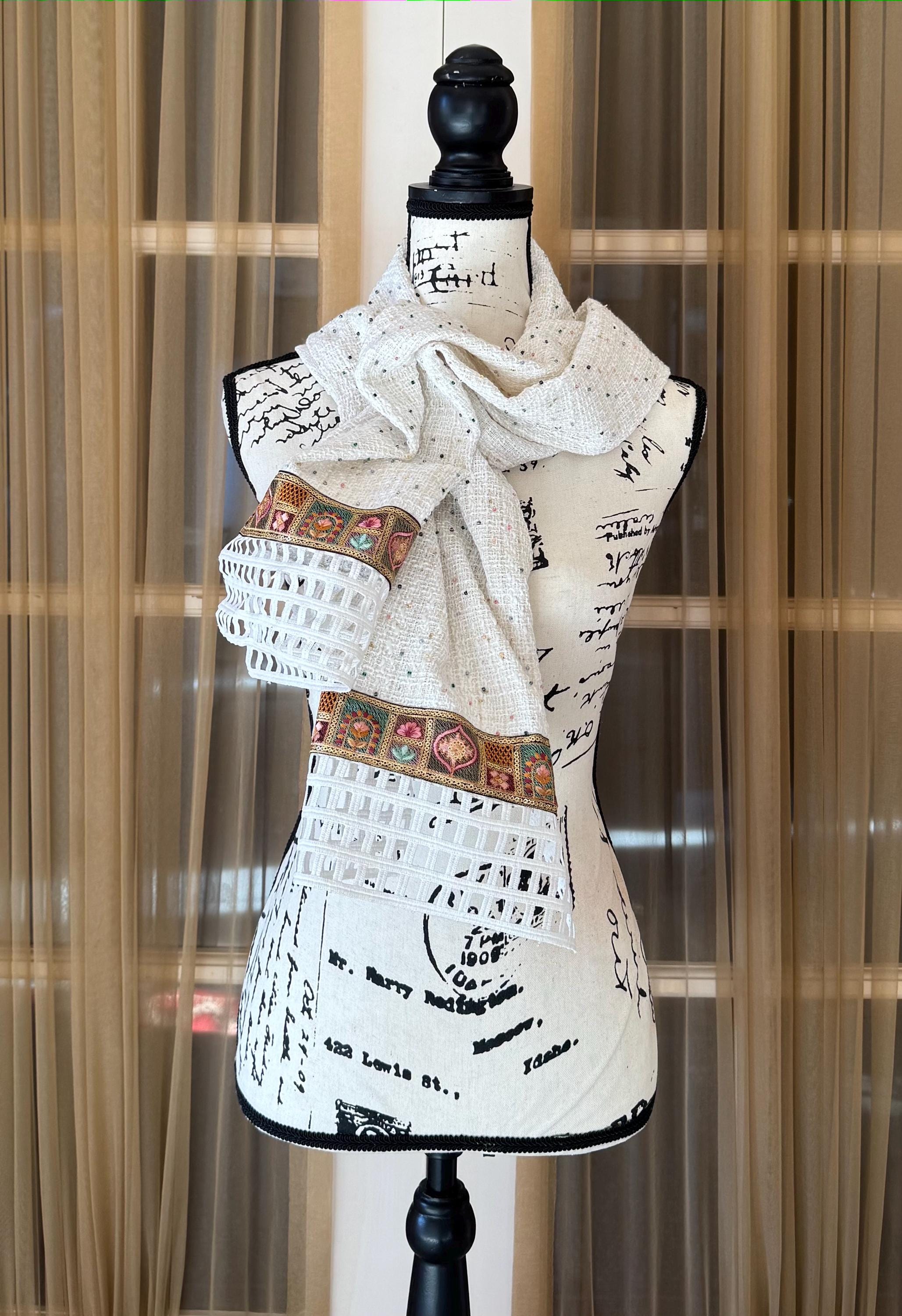 This beautiful handmade scarf has been created with a beaded rich material. We have embellished the scarf with a gorgeous colorful trim and a lace which makes the scarf perfect for any event.