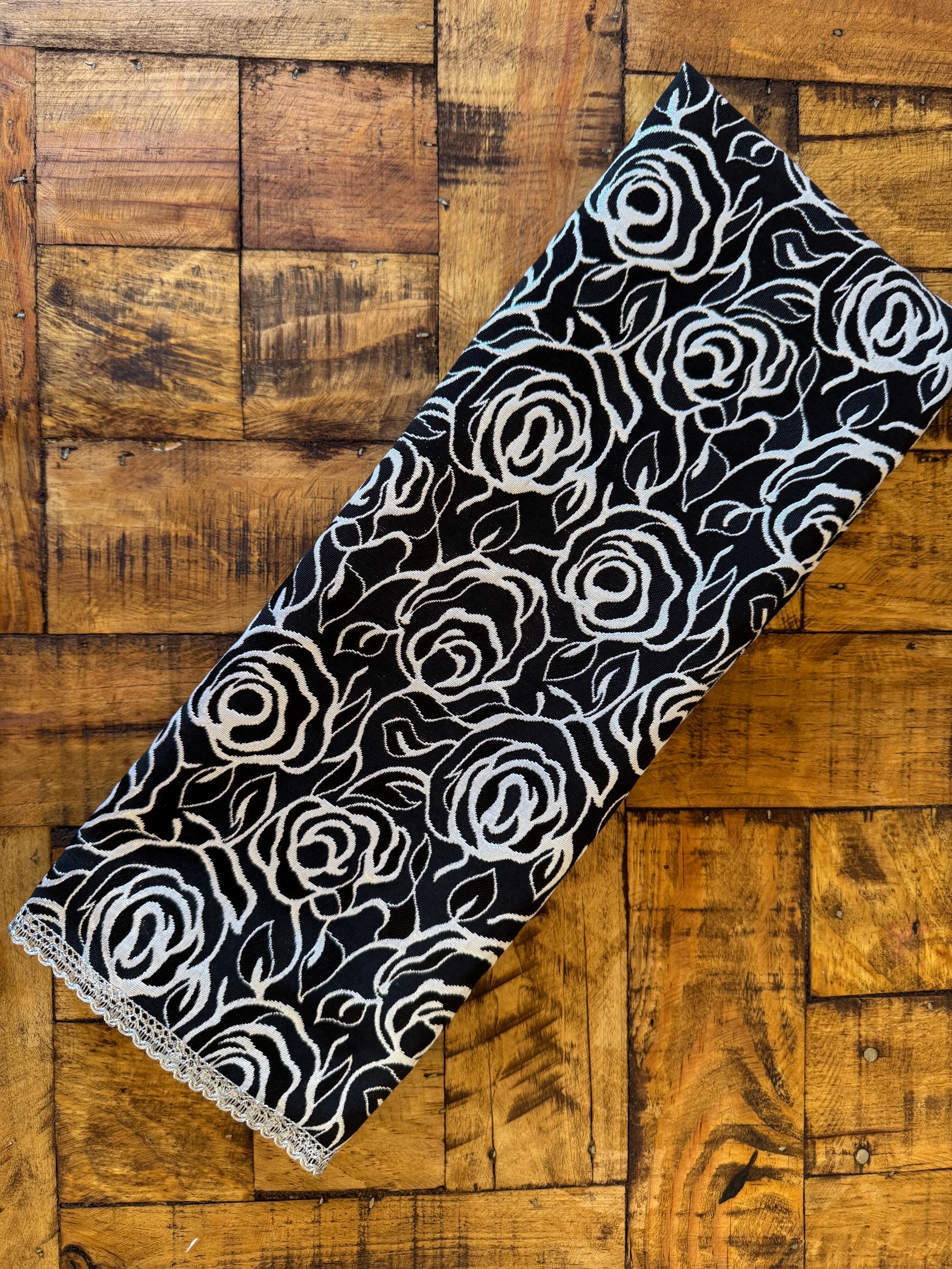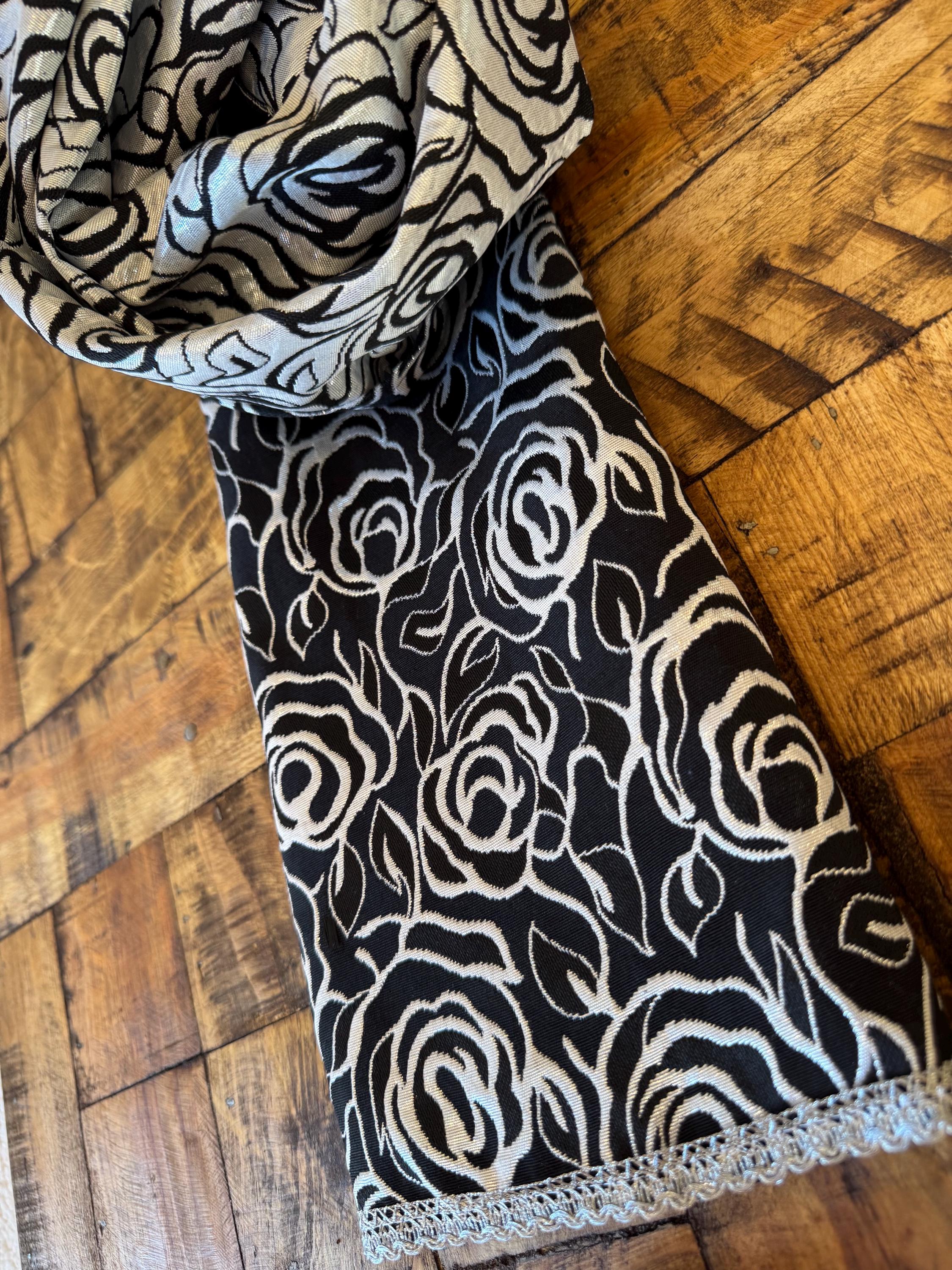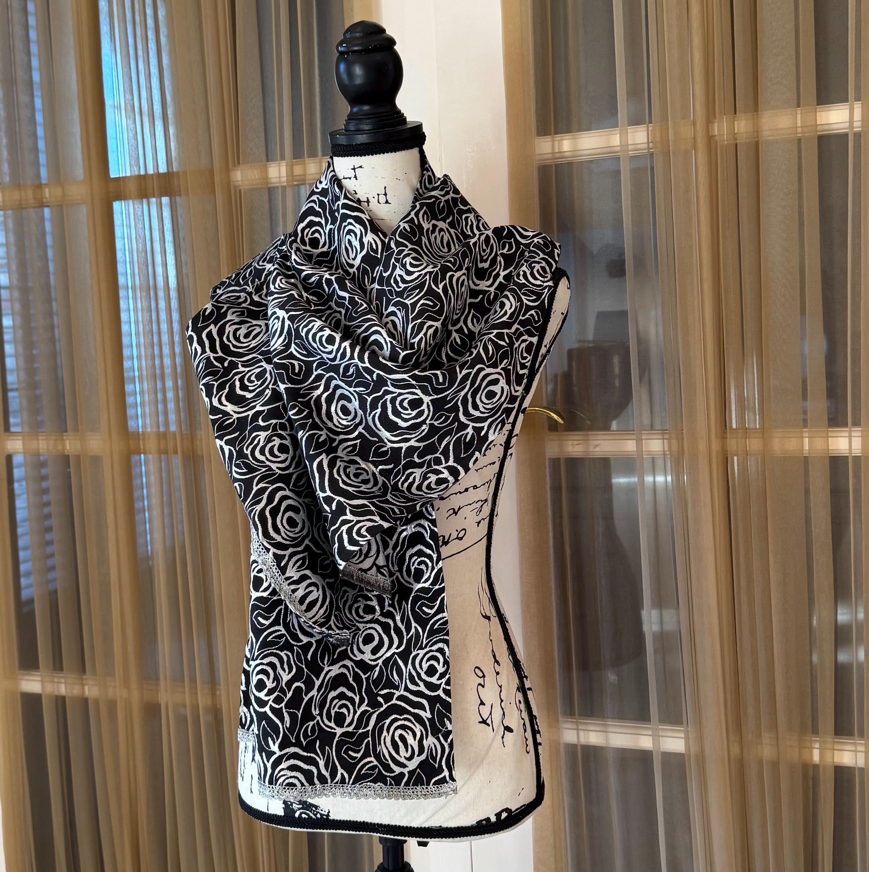 This beautiful handmade scarf is made with a rich material. We have embellished the scarf with a dainty lace that adds elegance and makes the scarf perfect for any event.