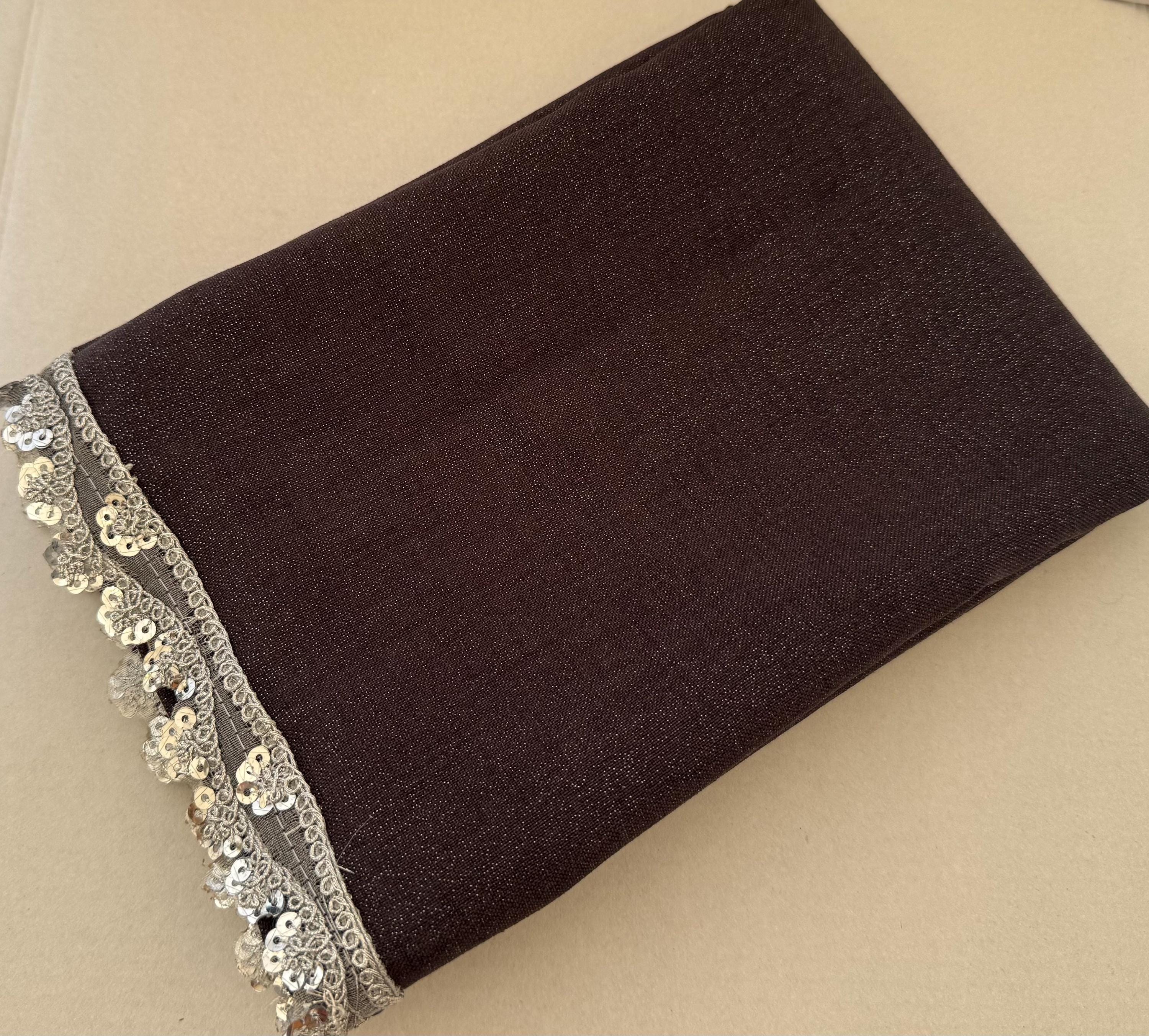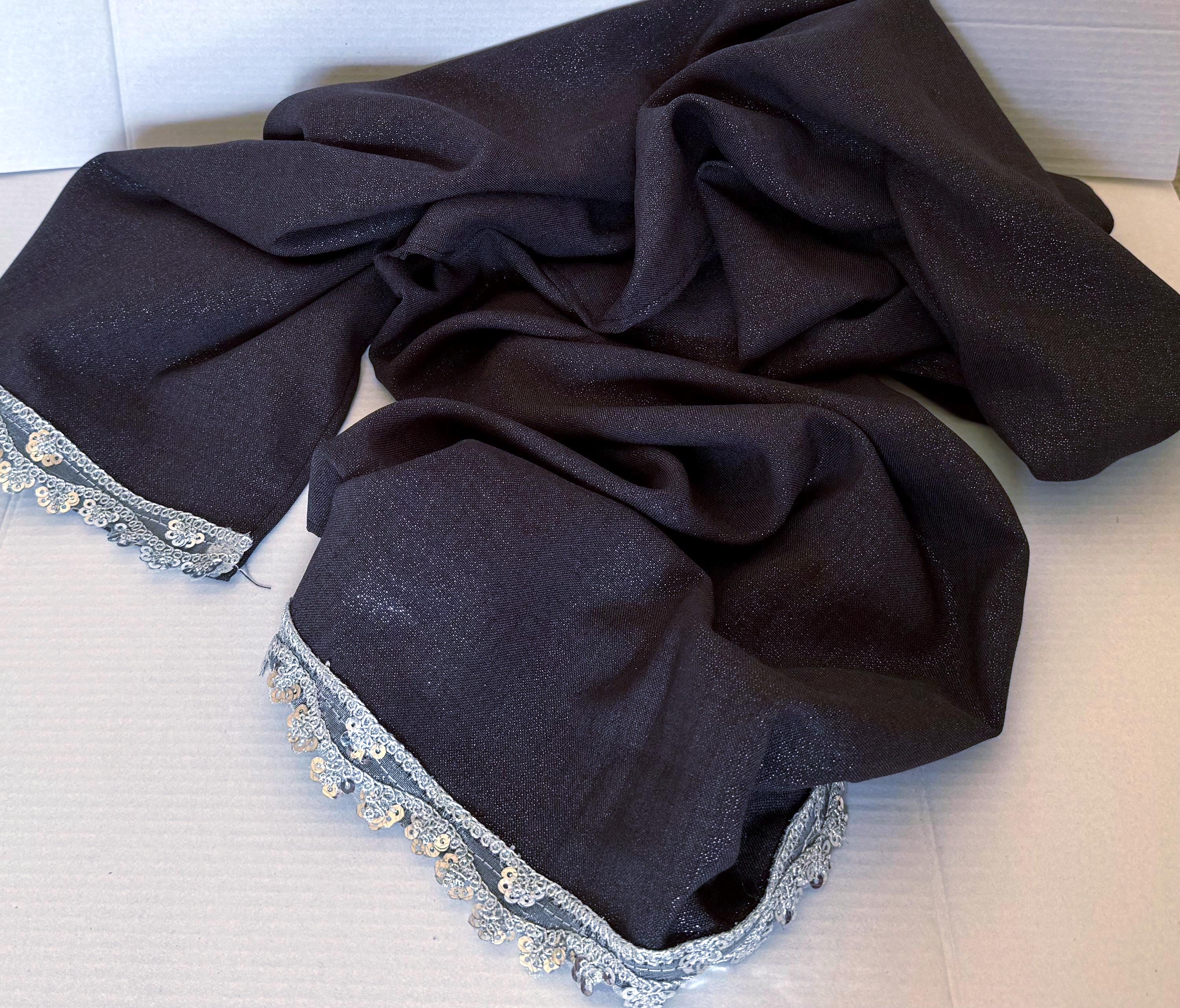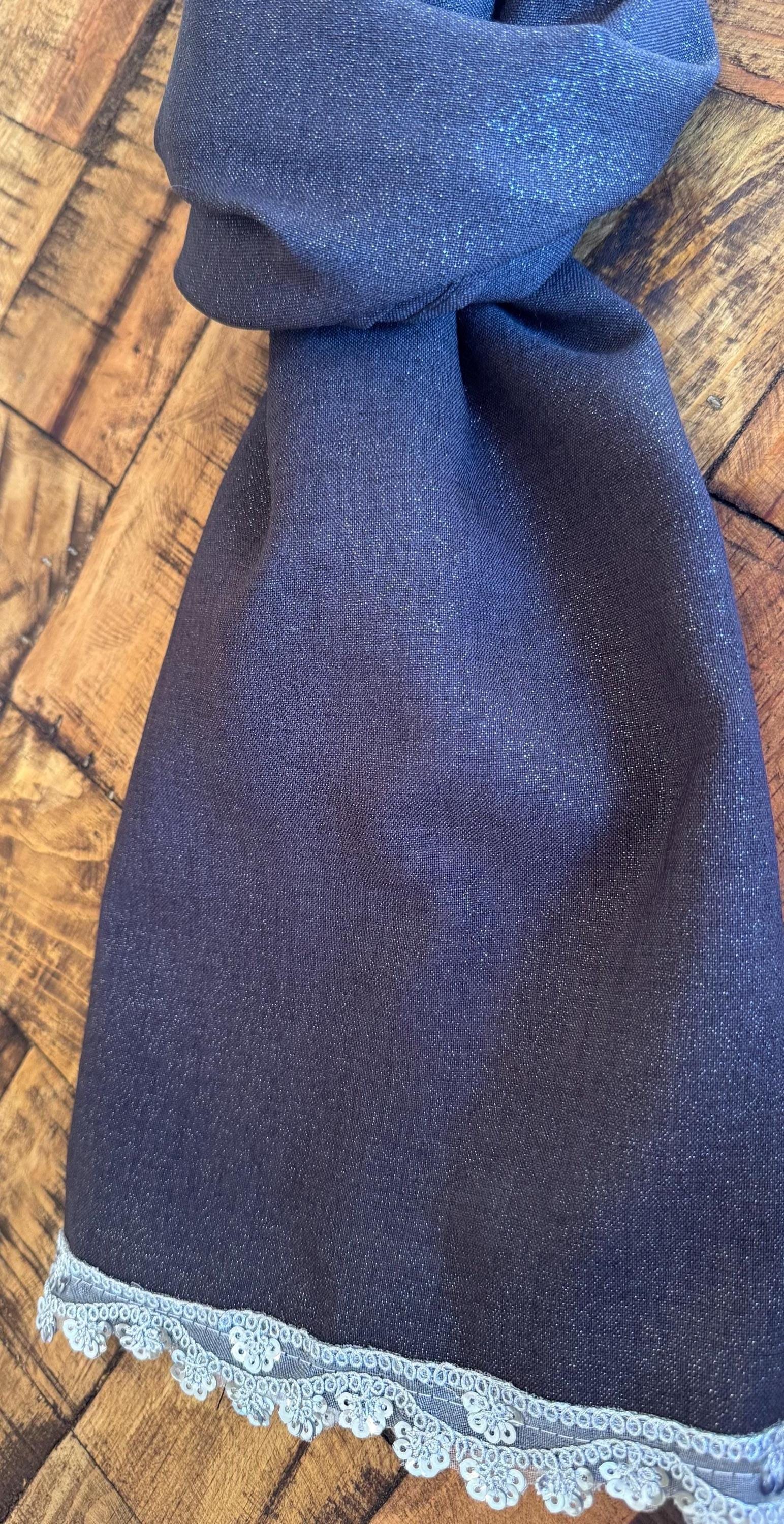 This beautiful handmade scarf is made with a rich dark gray, lightly shinny material that has a great fall. We have embellished the scarf with a dainty lace that adds elegance and makes the scarf perfect for any event.