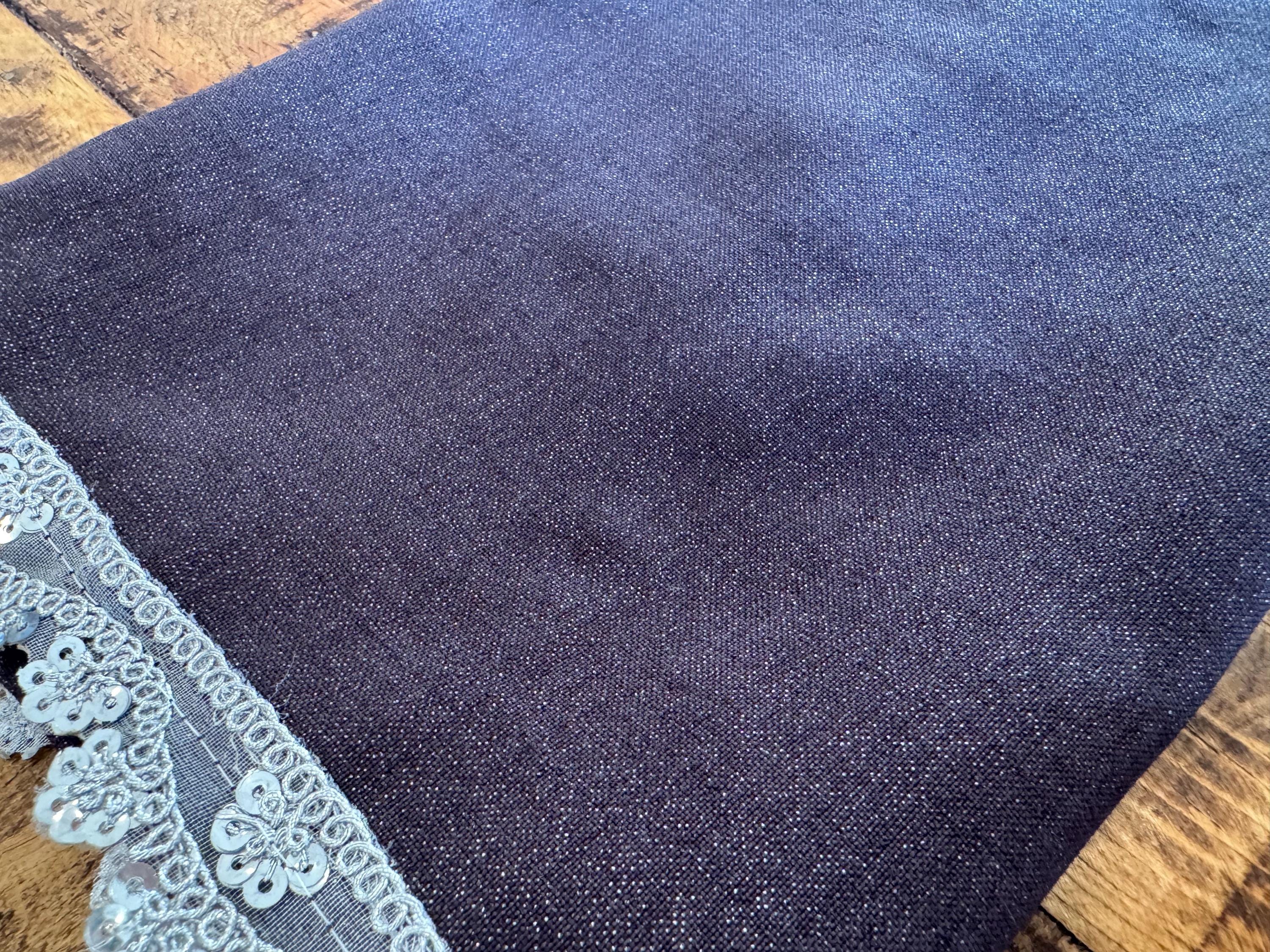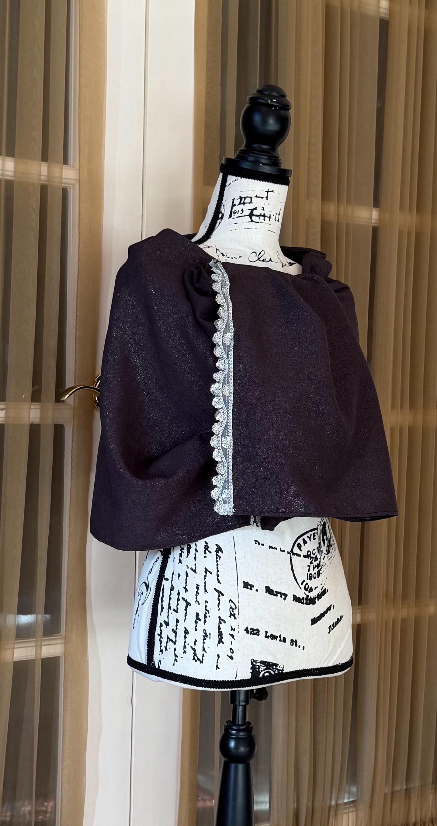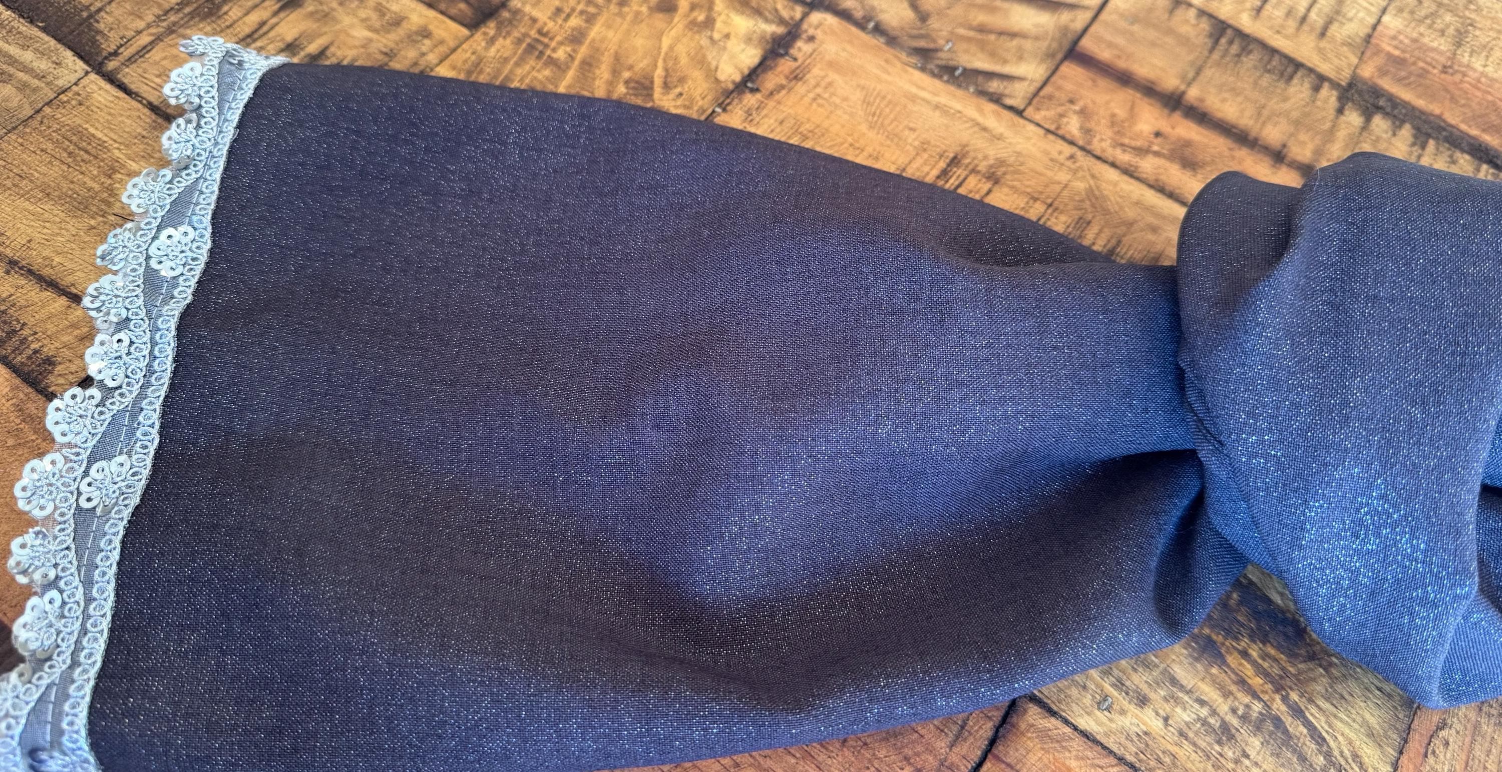 This beautiful handmade scarf is made with a rich dark gray, lightly shinny material that has a great fall. We have embellished the scarf with a dainty lace that adds elegance and makes the scarf perfect for any event.
