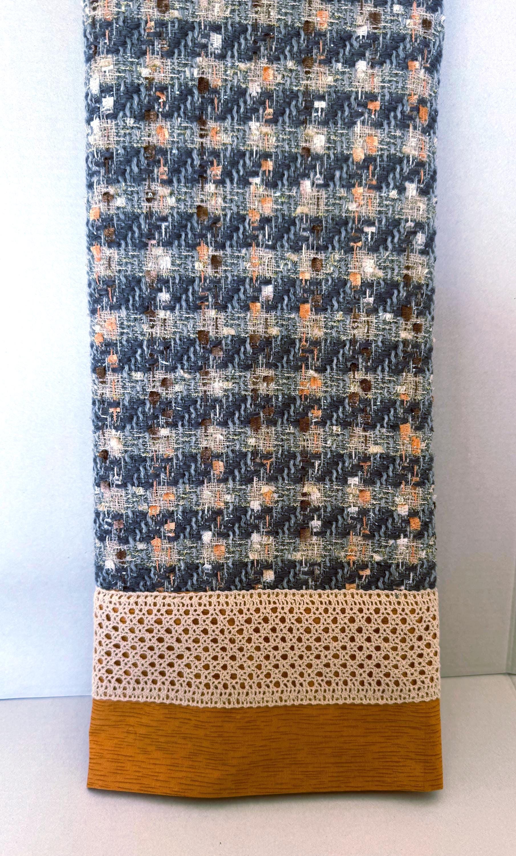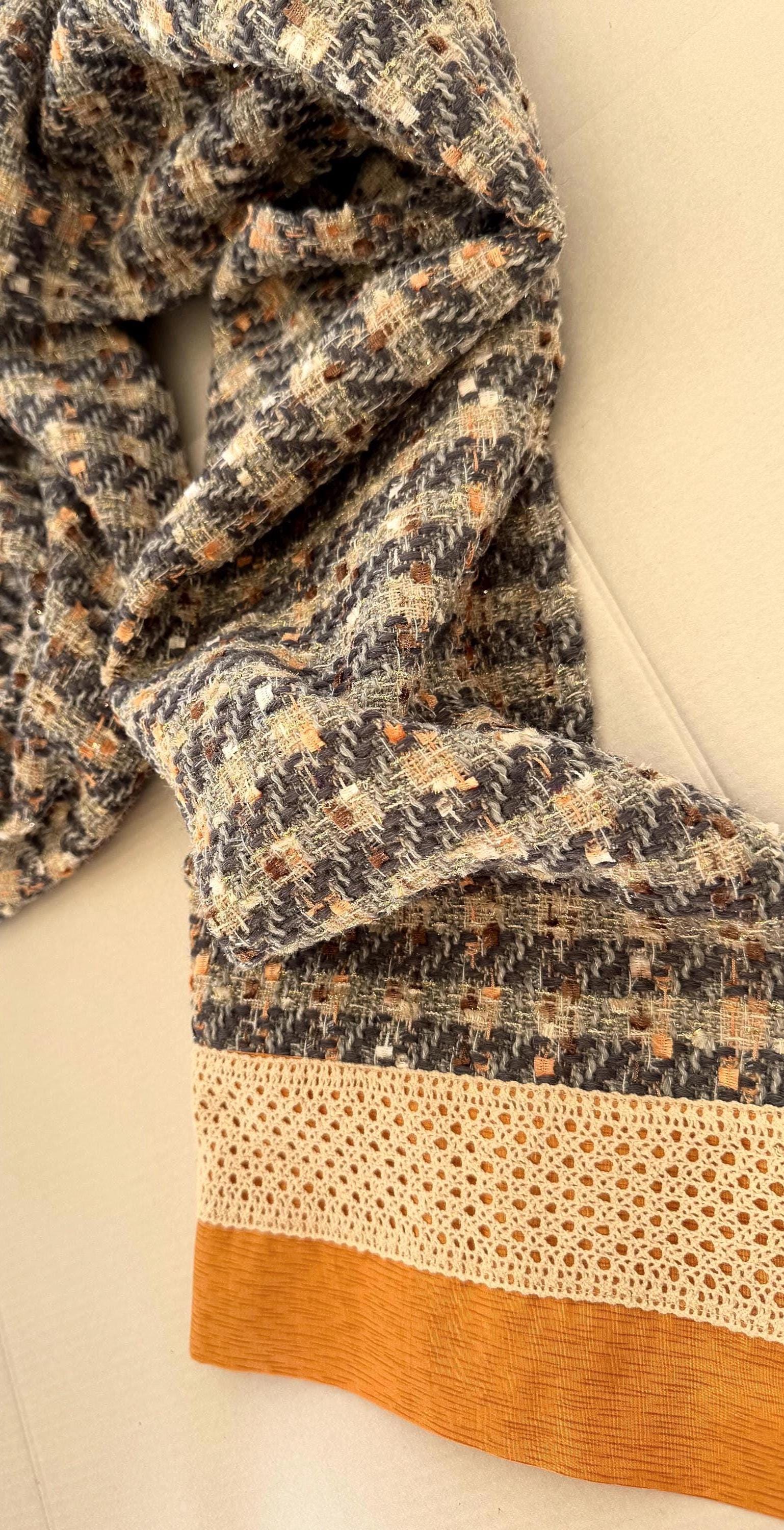 This beautiful handmade scarf is made with a rich material. We have embellished the scarf with a gorgeous lace that adds elegance and makes the scarf perfect for any event.