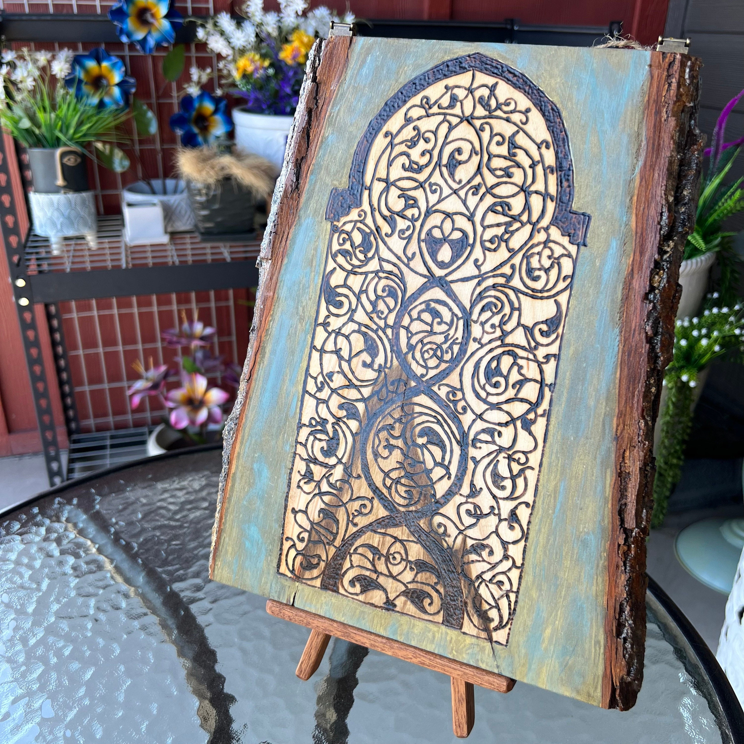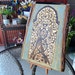 The Arabesque has created a 16th century inspired arabesque design inspired by the Champaneer Jama Mosque in Gujarat India. This mosque, a UNESCO world heritage site is very unique in its decorative composition and architecture. Unlike many other mosques, the ruler and local craftsmen who built it fused several age old Indic - Hindu and Jain - motifs to fit in an Islamic vocabulary of architecture. Champaner is a historical site in Gujarat India which was founded in the 8th century C.E. by the Chavda Dynasty. The city and its overlooking Pavagadh fort was later ruled by Rajputs in the Middle Ages. After the formation of the Gujarat Sultanate, the city was conquered by the Sultan of Gujarat, Mahmud Begada, between 1482 - 1484. For the next 23 years Mahmud continued renovating this city and bringing in local artisans to create a wonderful architectural program of civic and religious buildings. This beautiful medieval city and its architecture was the source of inspiration for this design. Mahmud brought several artistic elements into the city and especially the Jama Mosque which he constructed. Mahmud brought in all local artisans from the neighboring region to complete his vision. He hired both Muslim and Jain artisans to execute the design elements he wished to portray and the magnanimity he aimed to display in his buildings. The artisans used arabesque techniques as well as age old Hindu and Jain religious motifs for which they were already masters. This means that the 15th century city of Champaner houses some of the most interesting Indic, Jain, Hindu, and Muslim fused design elements, making the city very multicultural and bearing a unique Indian identity. This wall hanging is a testimony to that city and time period. It is ready to hang with a twine rope and measures 9 x 13 x 0.8 inches. It has been finished in a shellac coating
