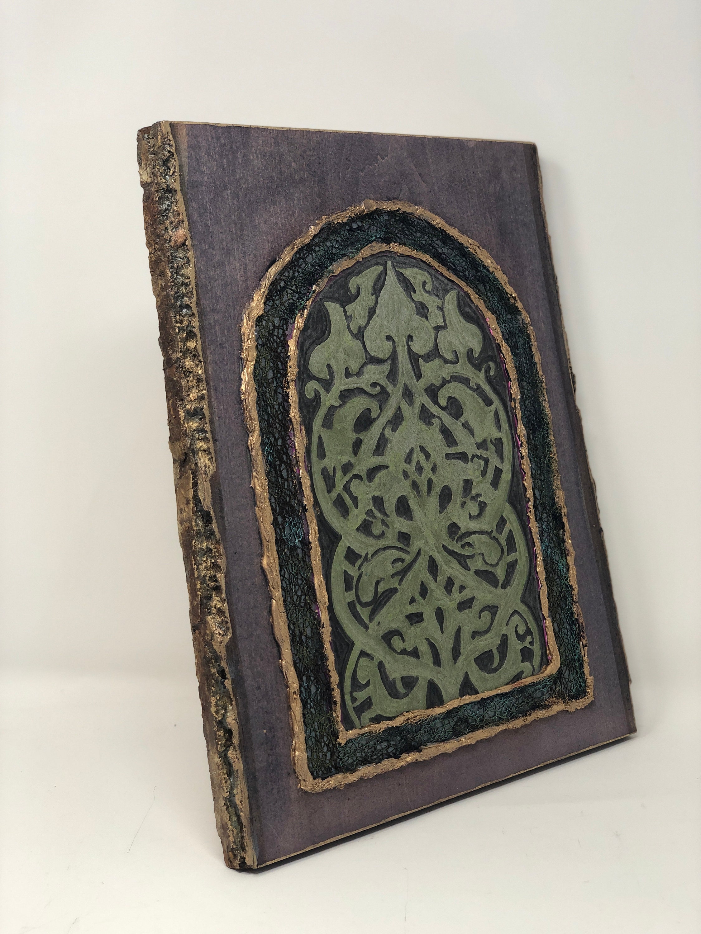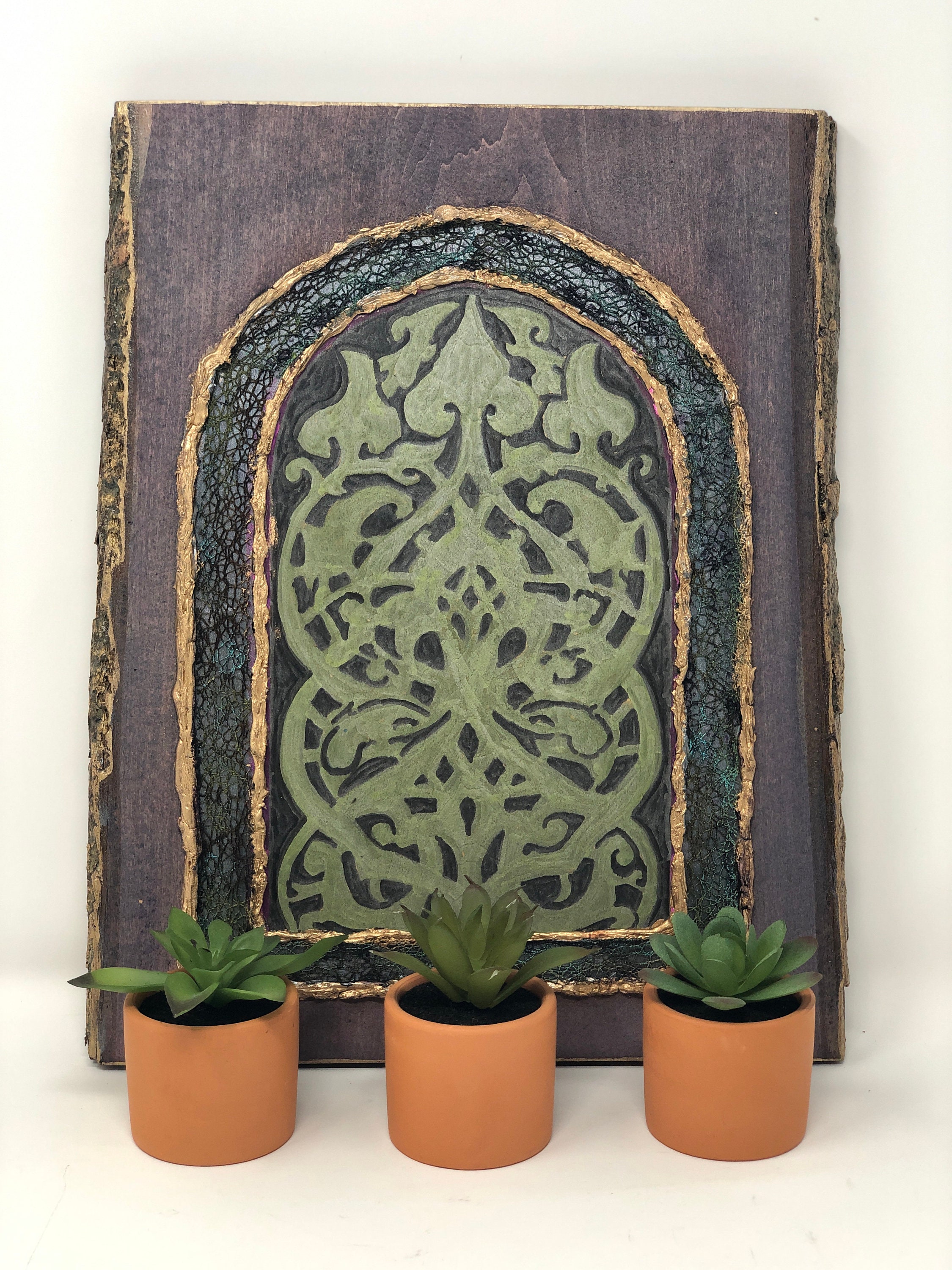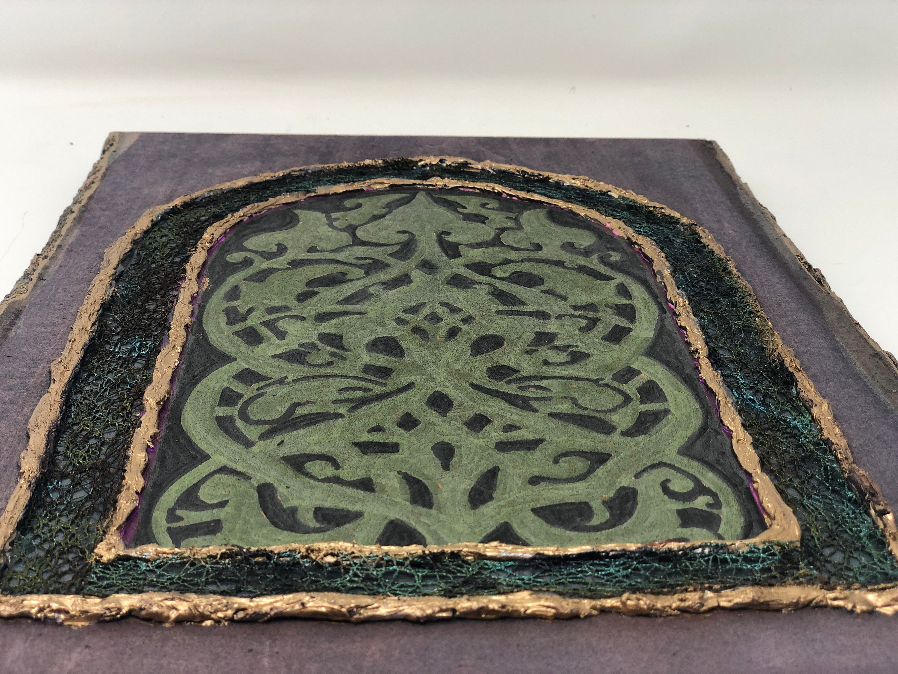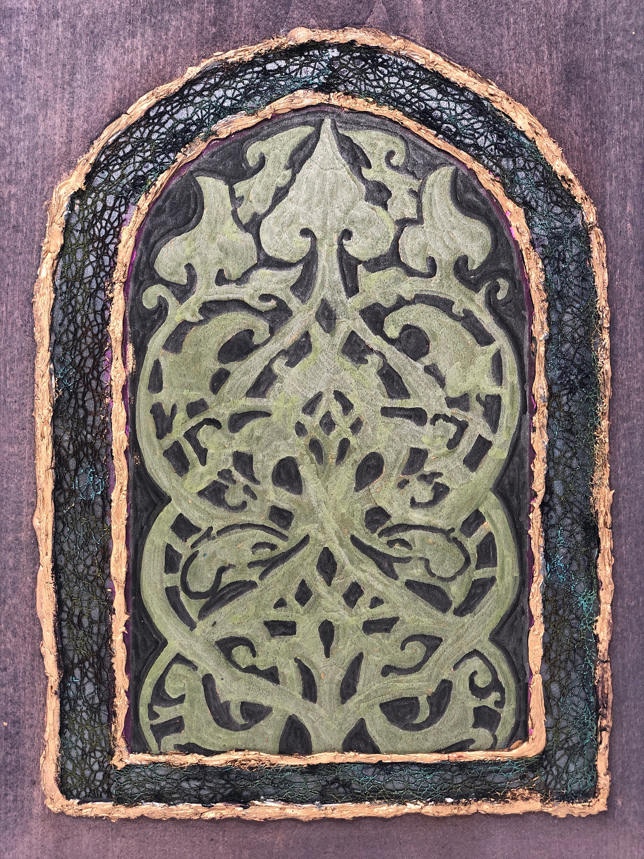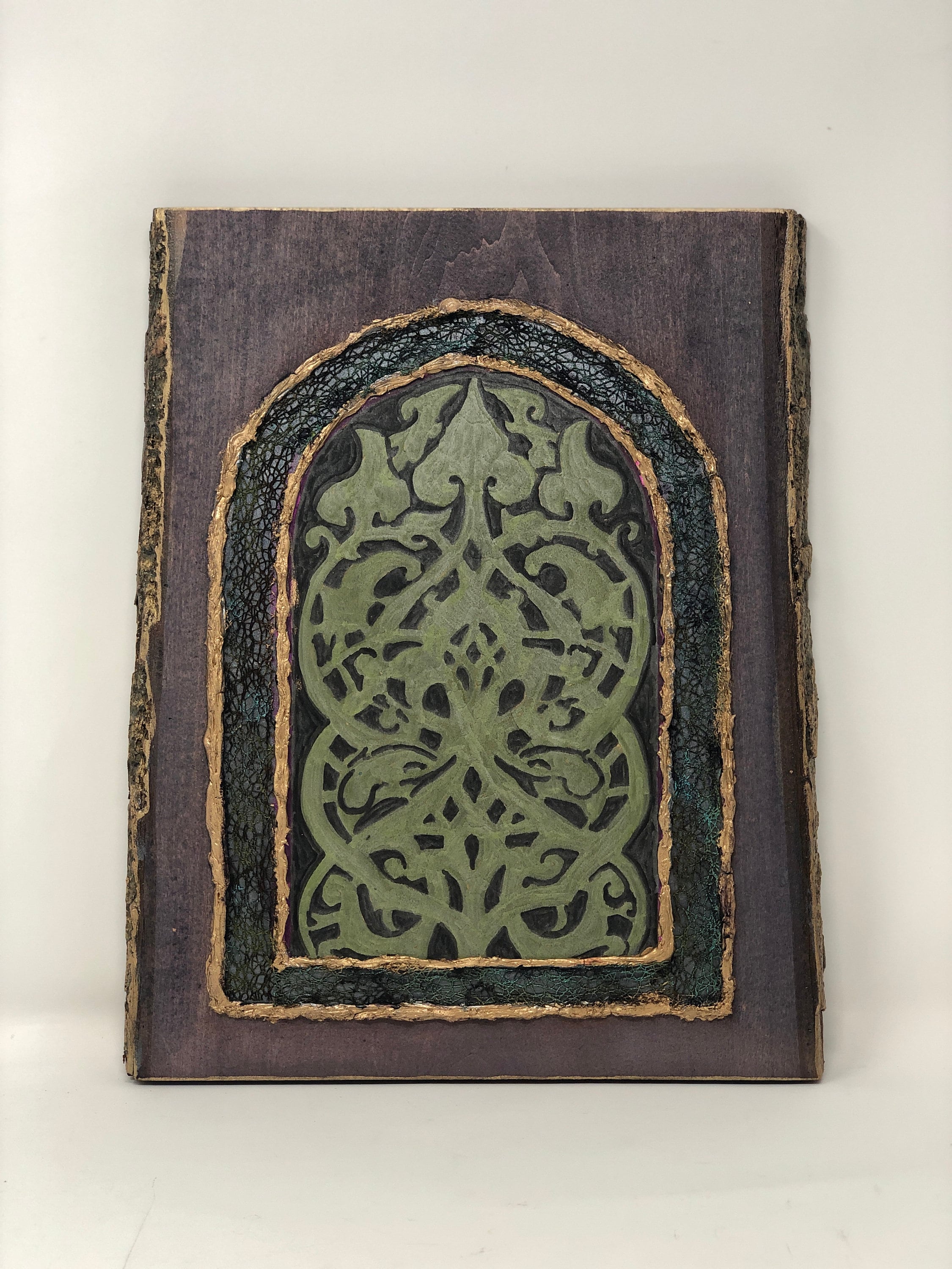 This semi-abstract work of art, based on the architectural feature of an arabesque laced window grille, is a tribute to the mosque's history and heritage. This 8 x 13 x 1 piece of basswood has been painted and embellished to create an abstract work of art.