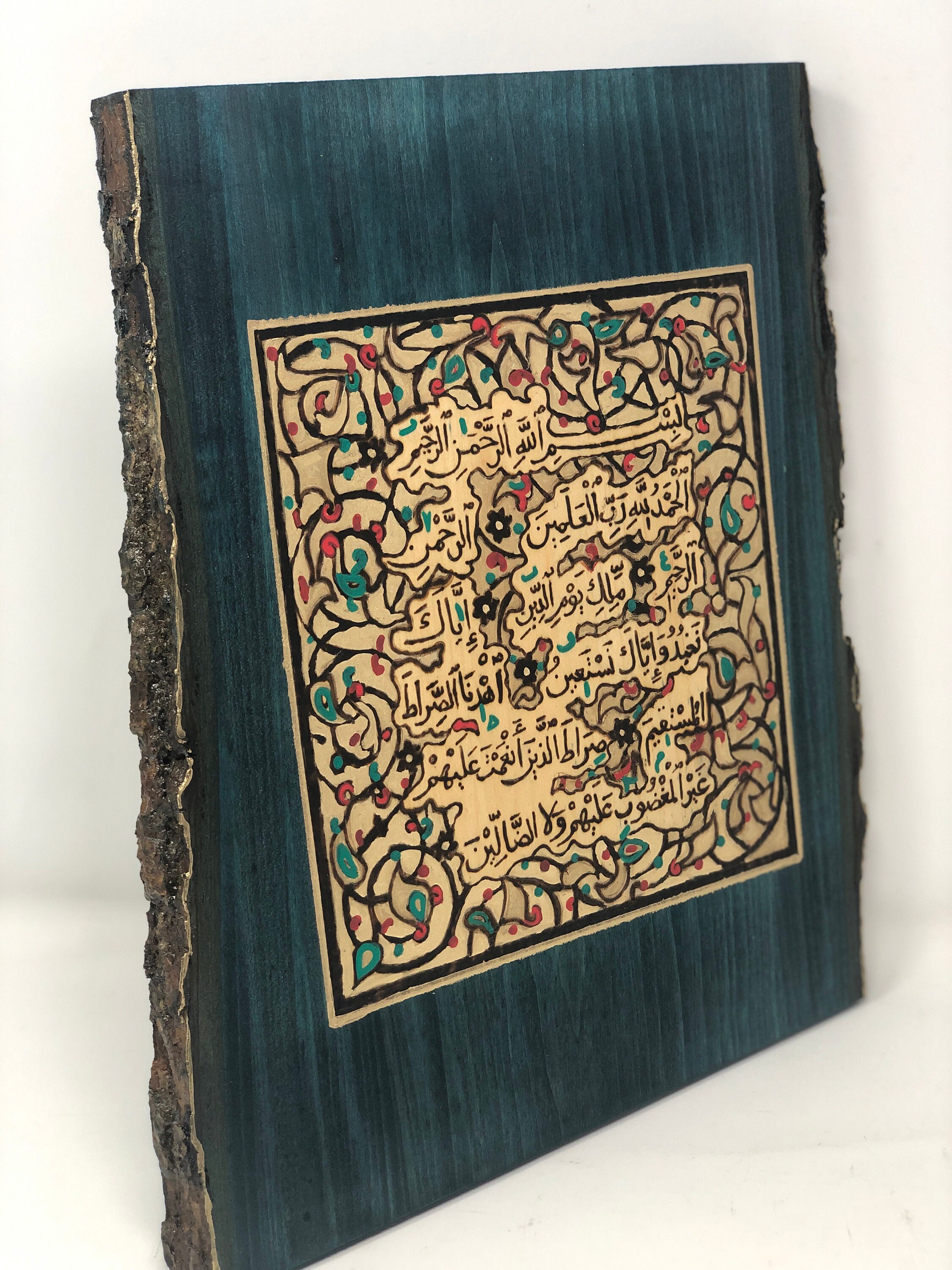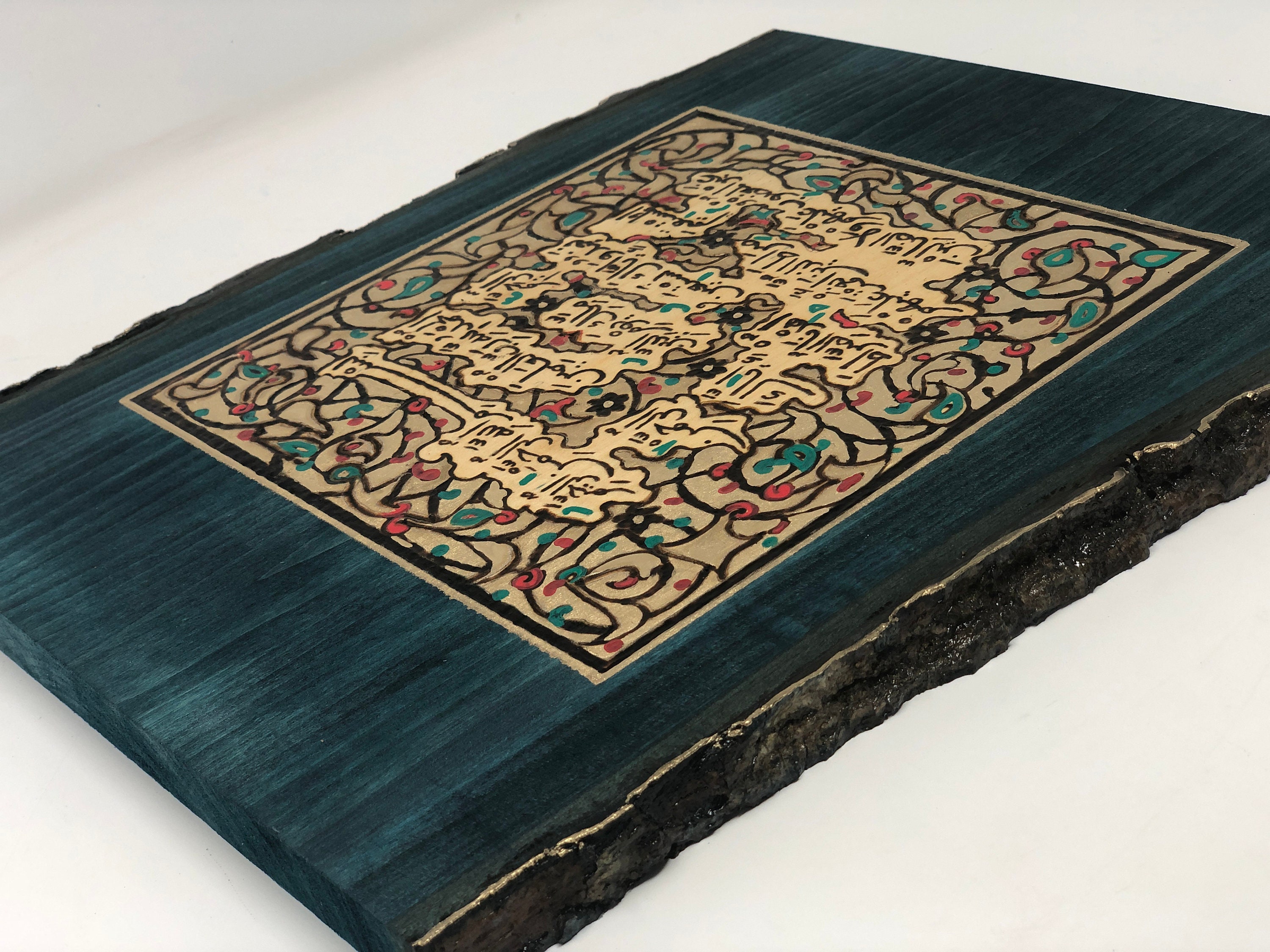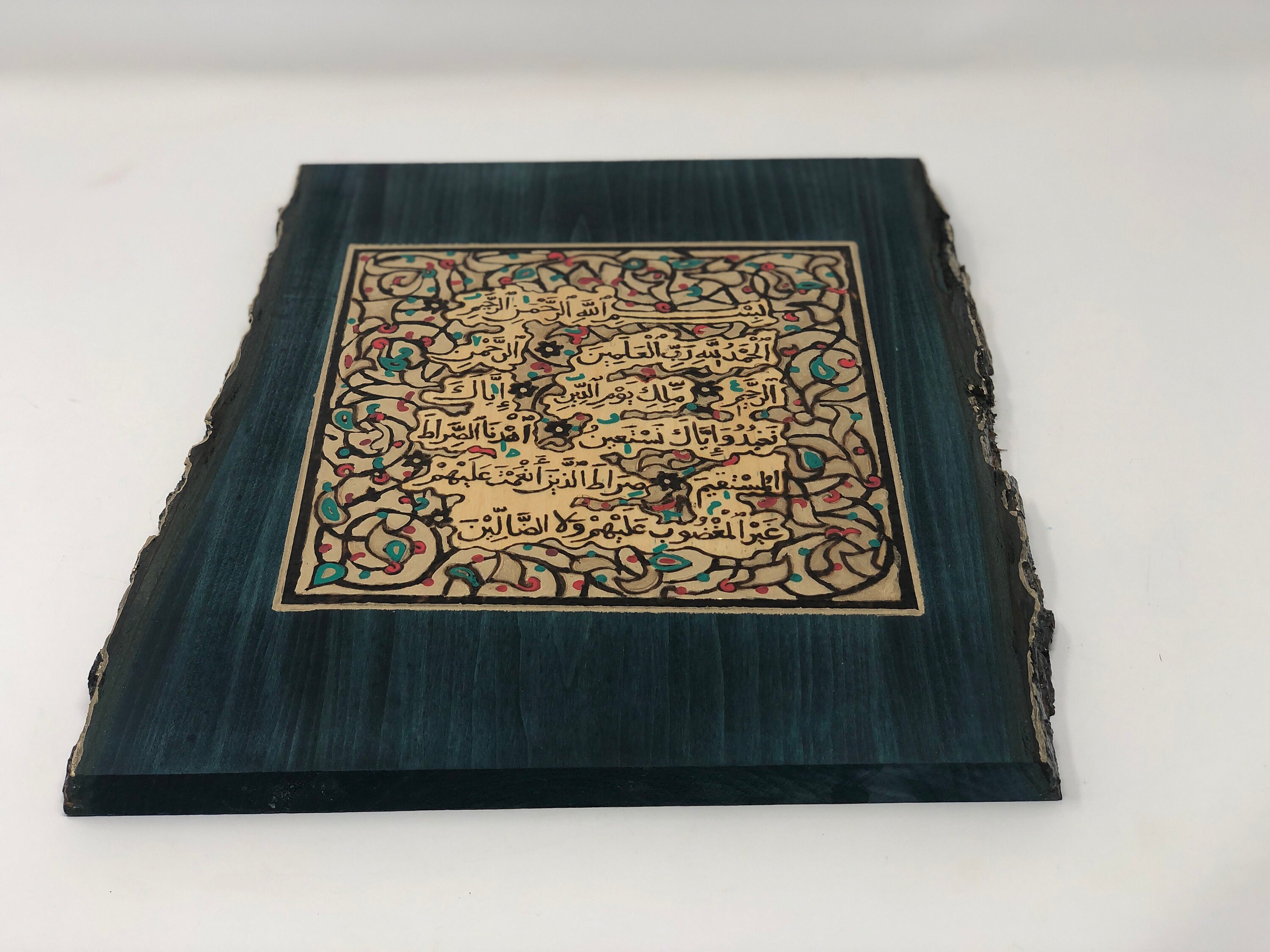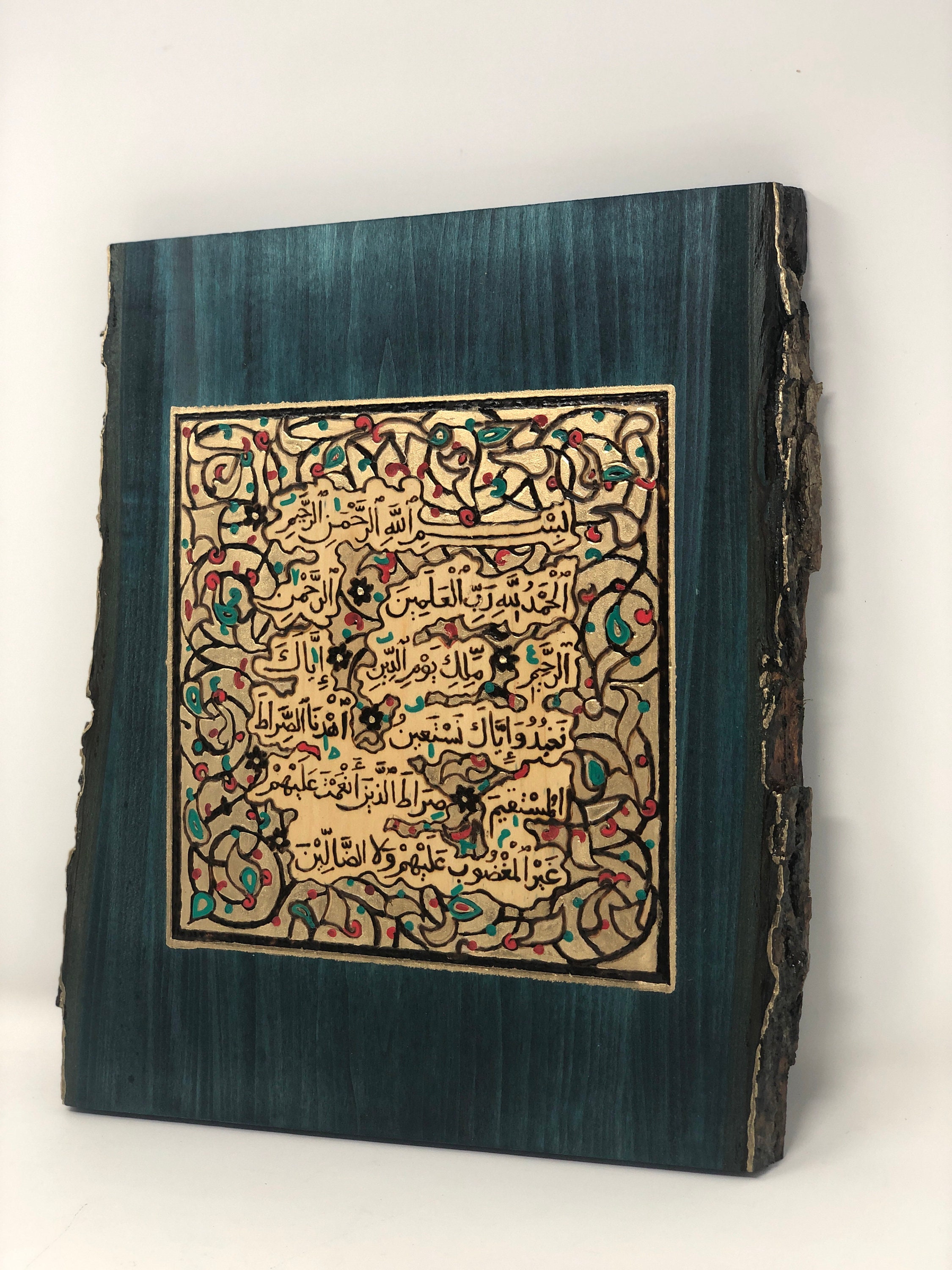 This work of art was inspired from a medieval Mamluk Quran which is in the manuscript collection of the Library of Congress in the United States. The Quran dates to the 14th century. This Quran is in naskh script typical to 14th and 15th century Mamluk society. Although the artwork we have created has alternate colors of gold, blue, red, and green to make this 14th century work of art our own, we have let the script, handwriting, and cloud cartouches in which the verses are written resemble the original. These are the opening verses of the Quran, al-Fatiha, and the arabesque design surrounding the scripture is stylized like the original Quran folio. You can get more information about this particular Quran folio at https://www.wdl.org/en/item/6807/.