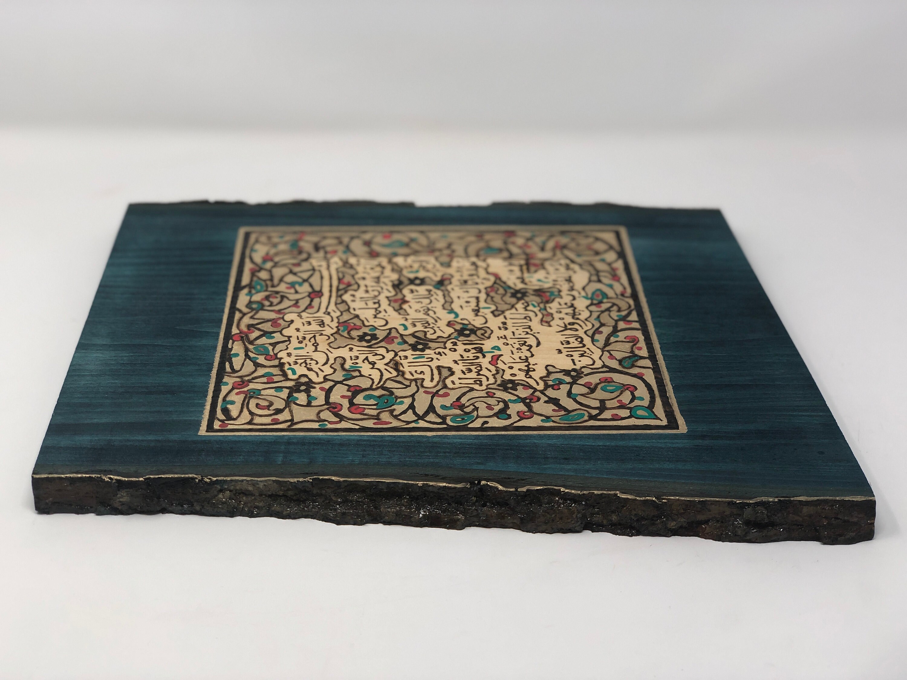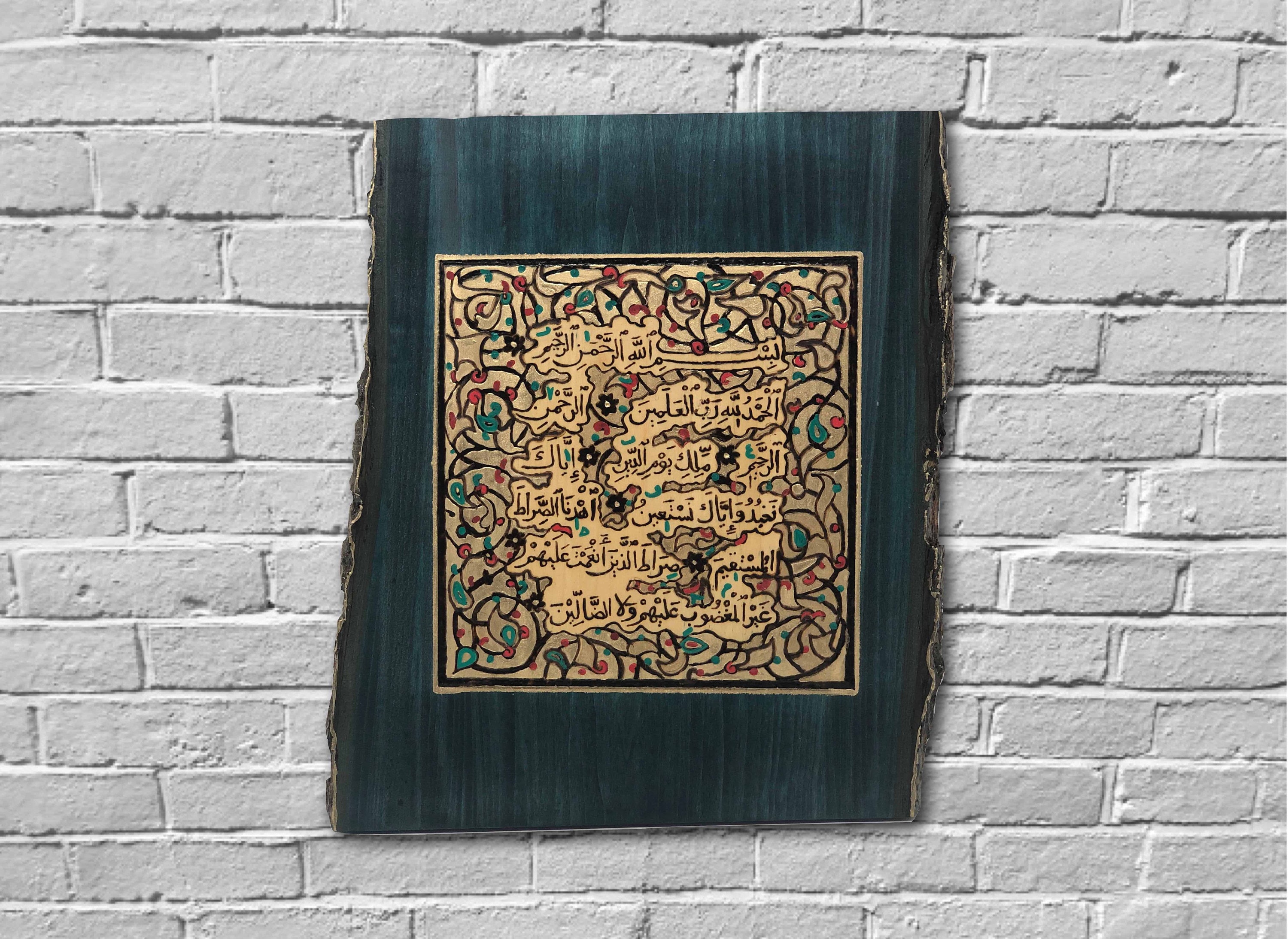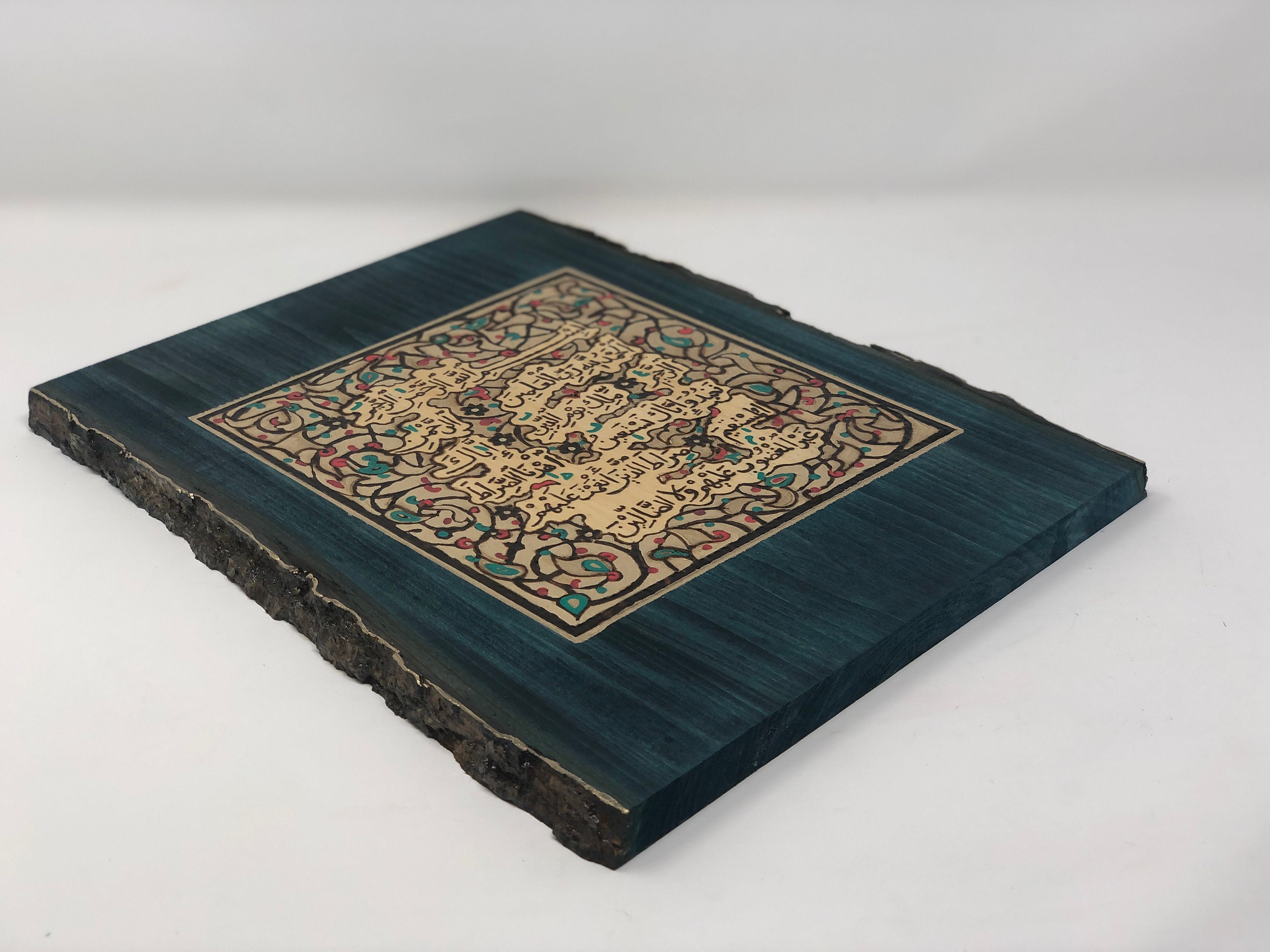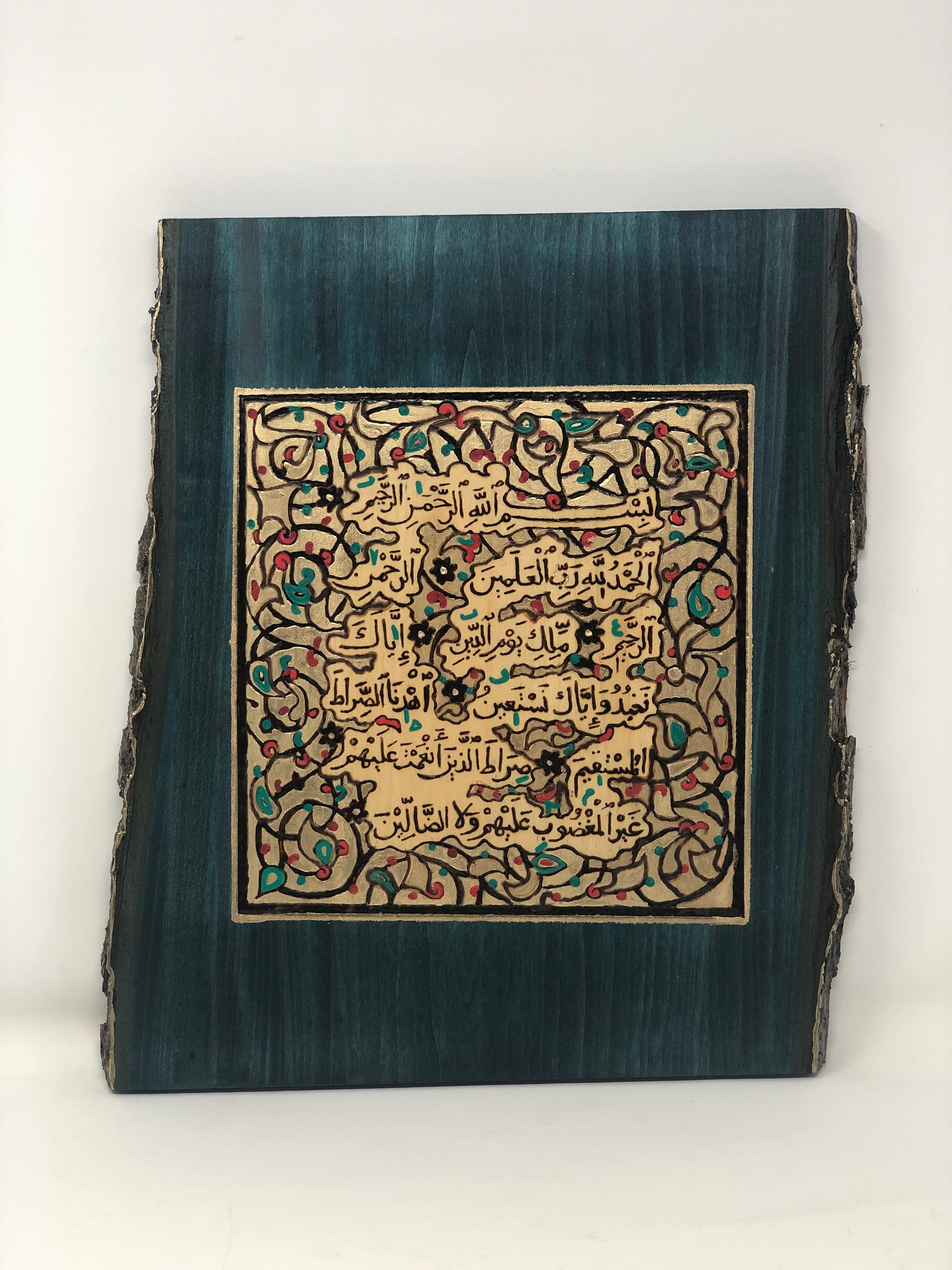 This work of art was inspired from a medieval Mamluk Quran which is in the manuscript collection of the Library of Congress in the United States. The Quran dates to the 14th century. This Quran is in naskh script typical to 14th and 15th century Mamluk society. Although the artwork we have created has alternate colors of gold, blue, red, and green to make this 14th century work of art our own, we have let the script, handwriting, and cloud cartouches in which the verses are written resemble the original. These are the opening verses of the Quran, al-Fatiha, and the arabesque design surrounding the scripture is stylized like the original Quran folio. You can get more information about this particular Quran folio at https://www.wdl.org/en/item/6807/.