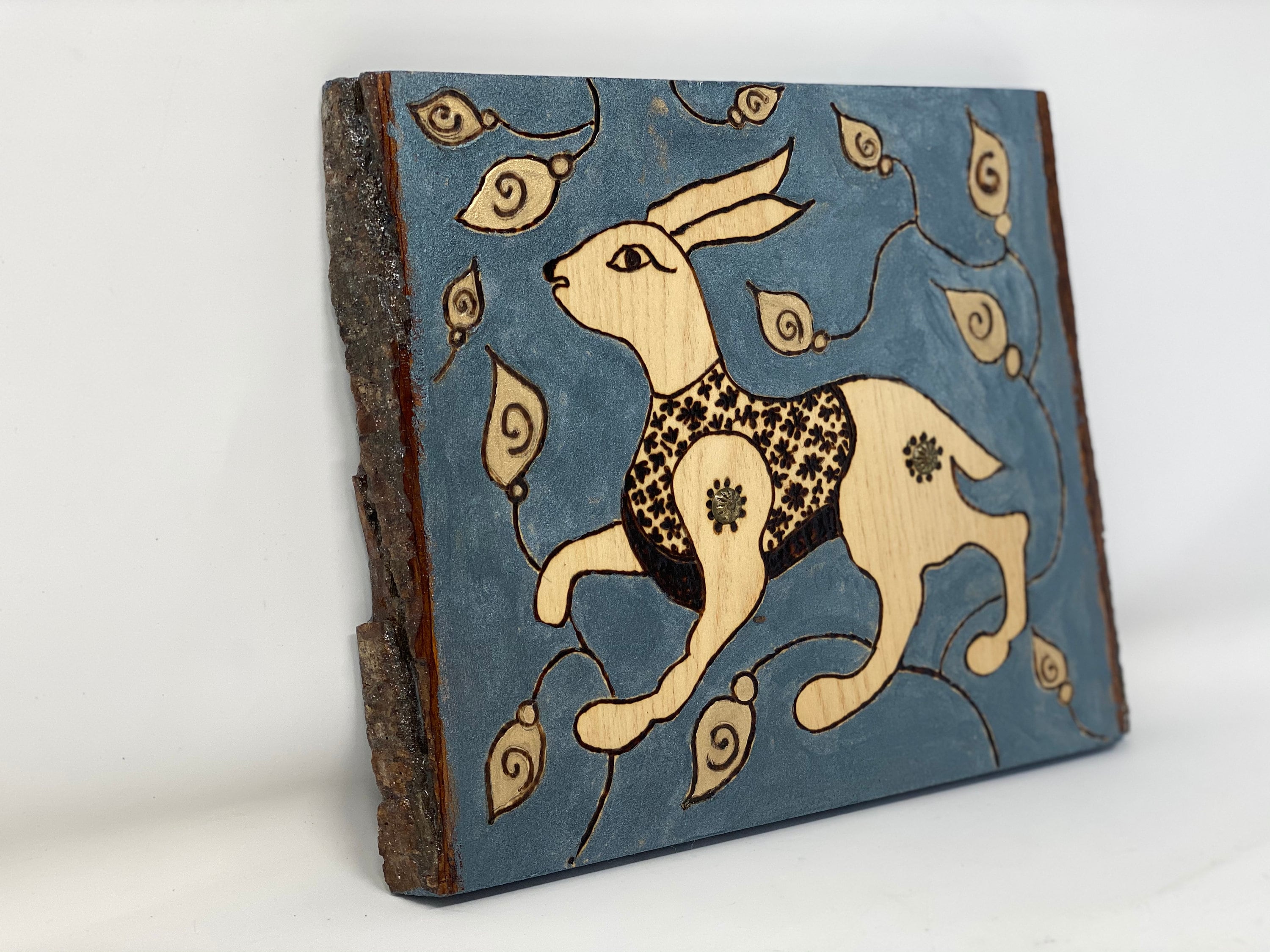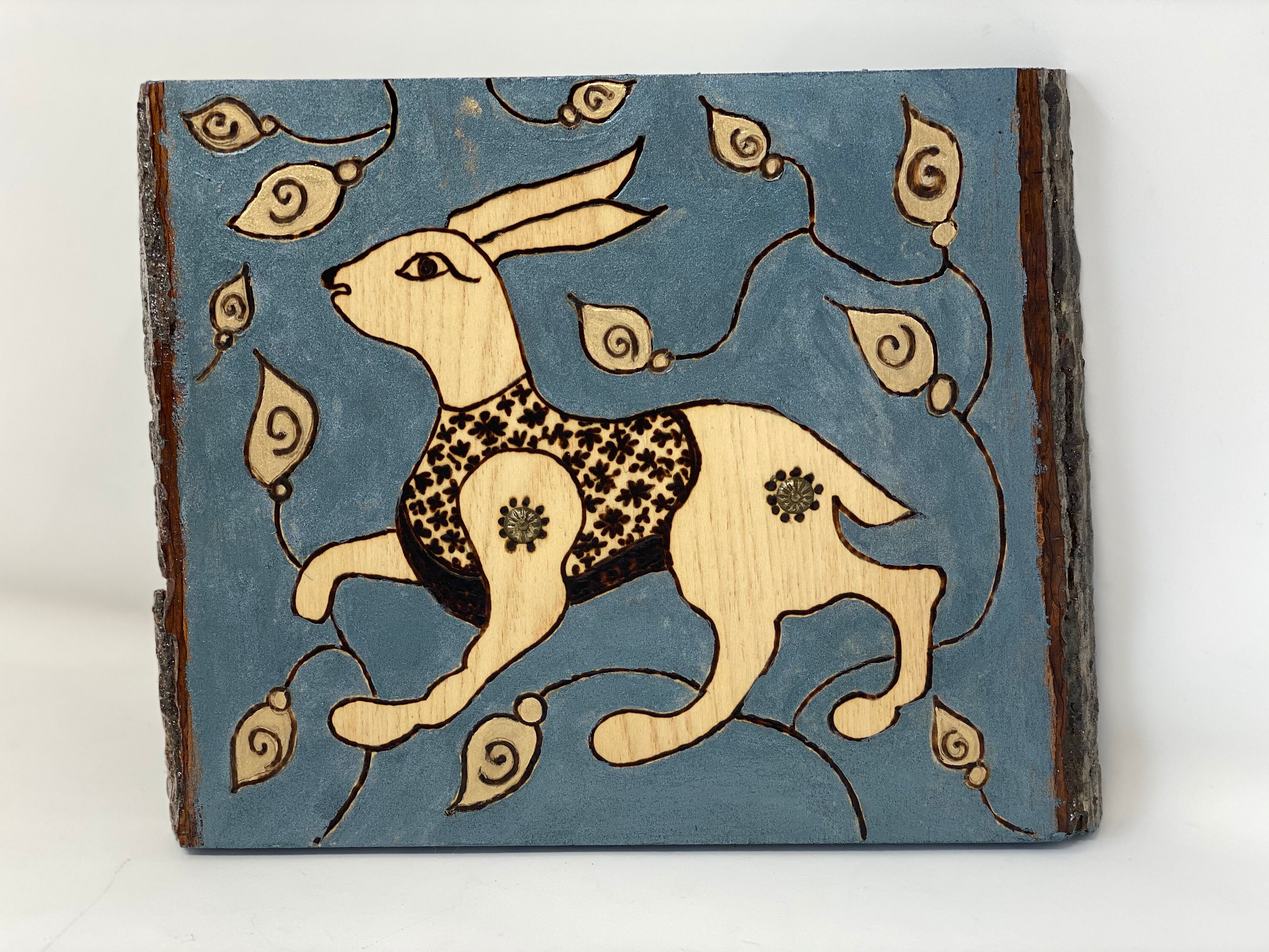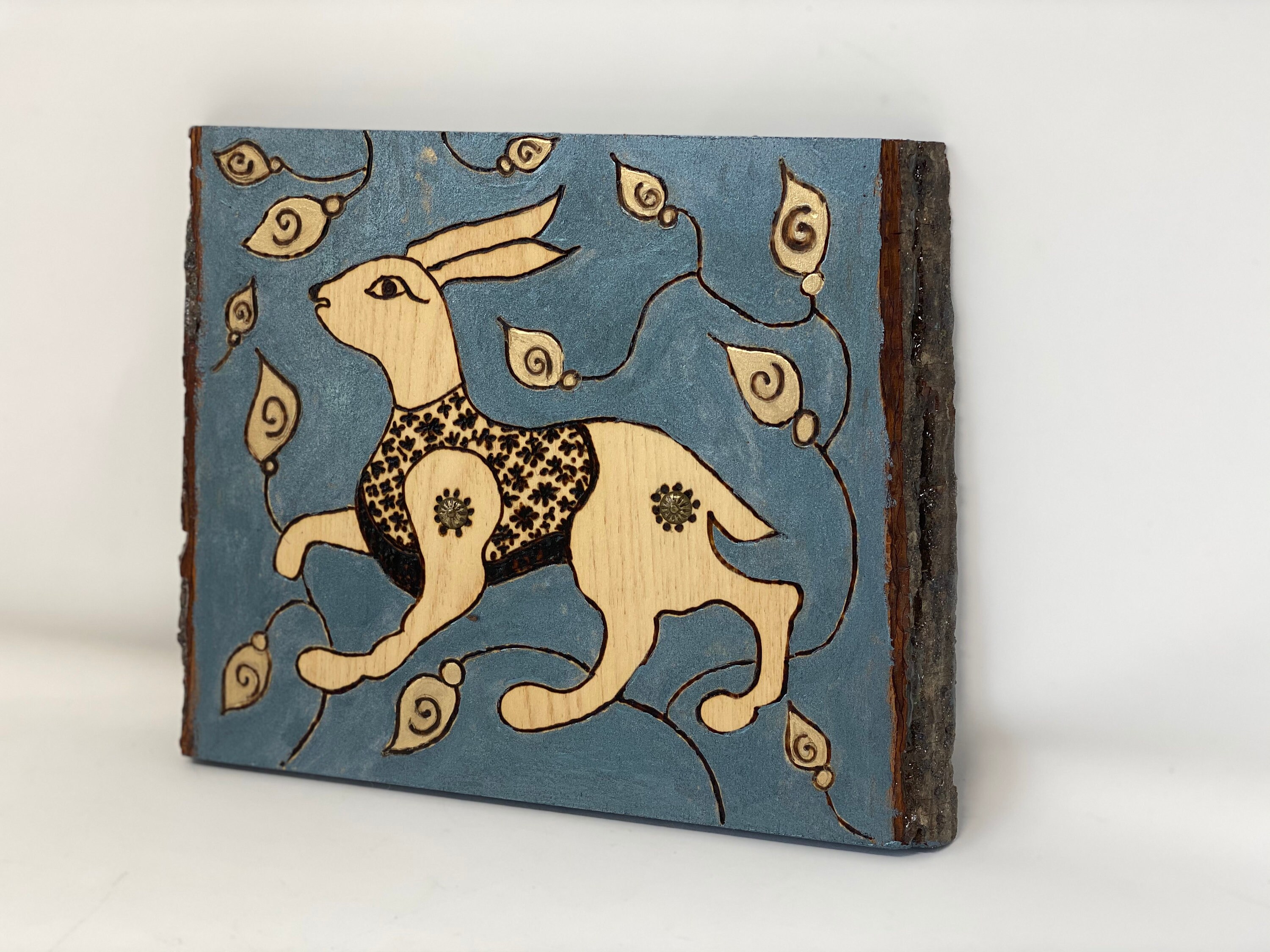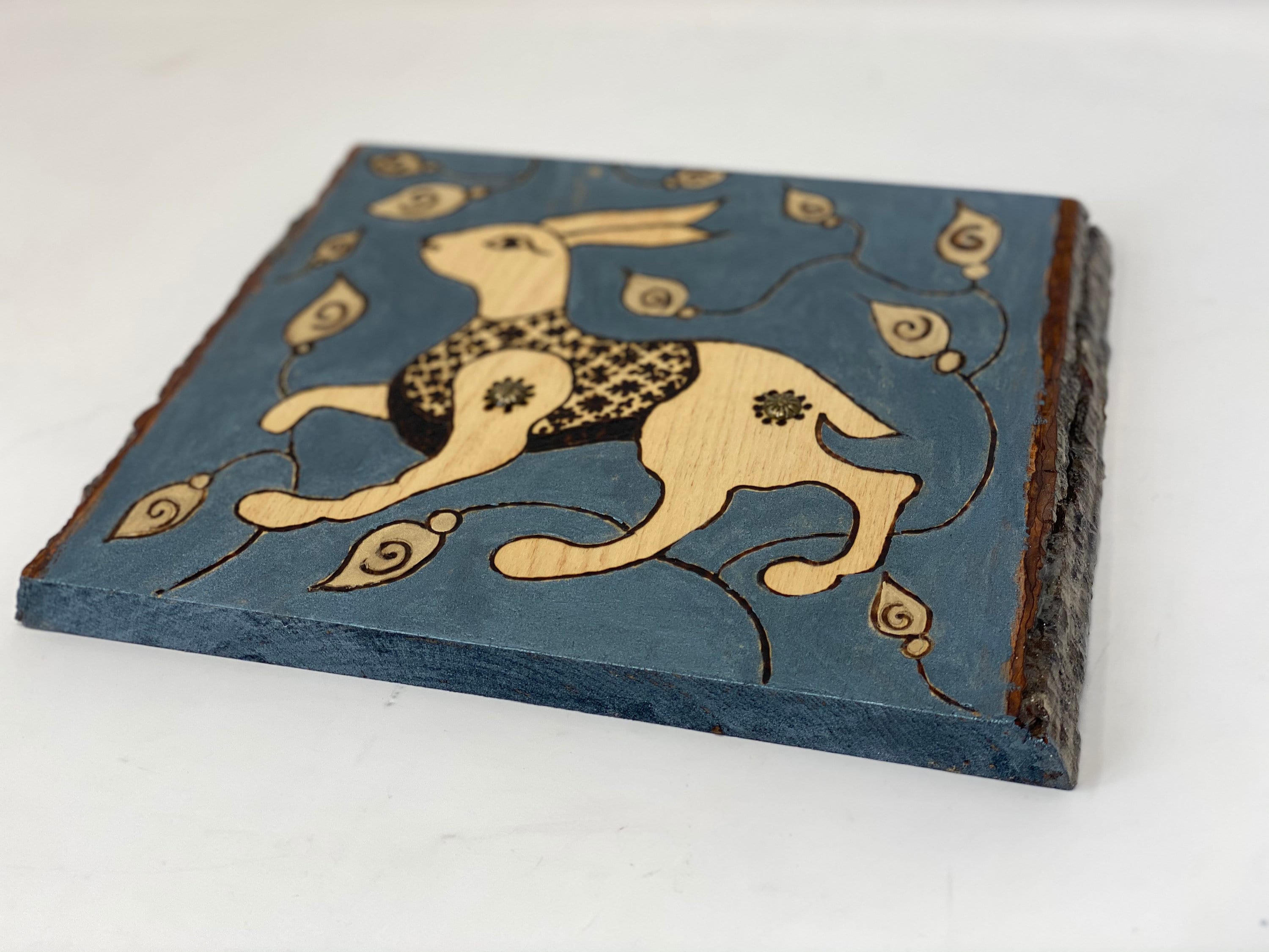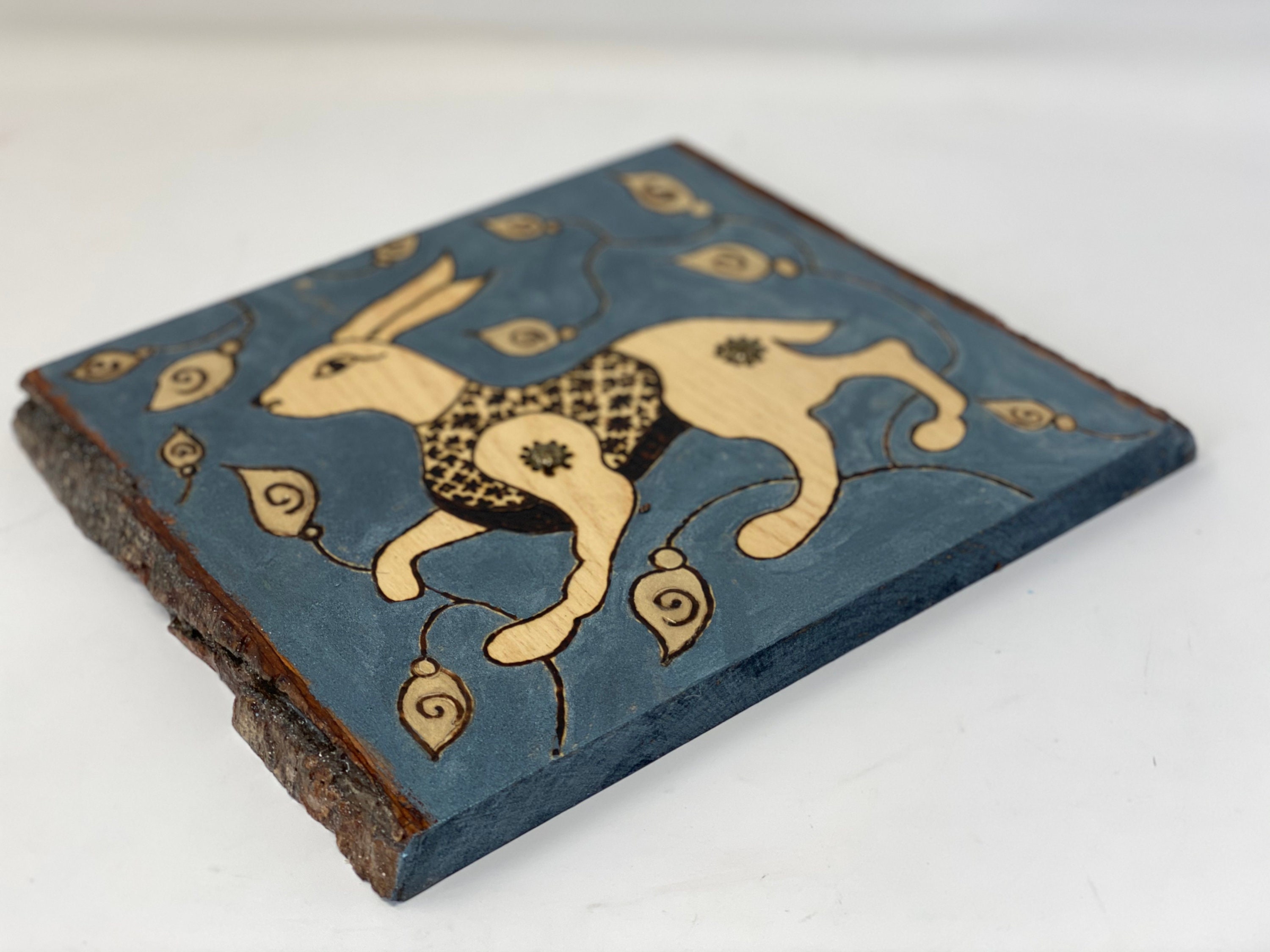 The Arabesque has been inspired by medieval hare motifs and illustrations in our own recreation of artwork from the Middle Ages. The hare has been a commonly used artistic motif in a variety of cultures appearing in art and architecture throughout antiquity and the Middle Ages. Along with being a beautiful formation created by nature, the hare also symbolized mysticism, good luck, fortune, and prosperity. This was a shared idea and why this incredibly cute animal appears in the artwork of so many cultures. The Arabesque brings you a medieval 11th century Fatimid arabesque motif designed on this one-of-a-kind wall hanging or shelf art made on natural piece of basswood with live edge. It features a hare which originally comes from a ornamental panel made from bone and ebony wood inlay in Fatimid Egypt. Whether you love history, bunnies, nature, or just the design on this plaque- this home decor artwork is sure to impress. It is perfect for your nursery, your kids room, the game room, or your office. It's full of history and a wonderful conversation starter.